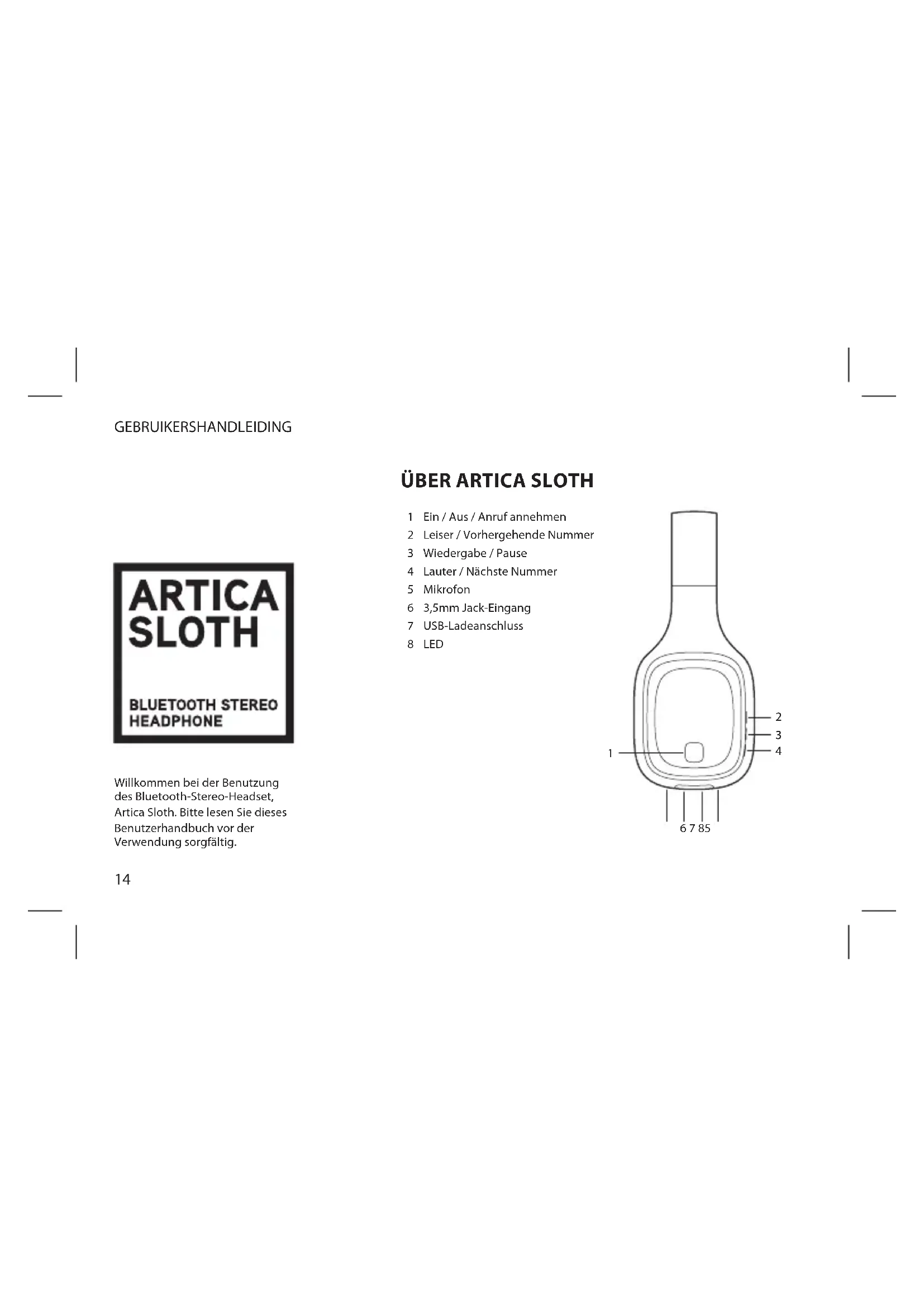 Willkommen bei der Benutzung des Bluetooth-Stereo-Headset, Artica Sloth. Bitte lesen Sie dieses Benutzerhandbuch vor der Verwendung sorgfältig.DEUTSCH
