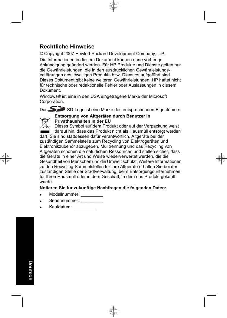 © Copyright 2007 Hewlett-Packard Development Company, L.P. Die Informationen in diesem Dokument können ohne vorherige Ankündigung geändert werden. Für HP Produkte und Dienste gelten nur die Gewährleistungen, die in den ausdrücklichen Gewährleistungserklärungen des jeweiligen Produkts bzw. Dienstes aufgeführt sind. Dieses Dokument gibt keine weiteren Gewährleistungen. HP haftet nicht für technische oder redaktionelle Fehler oder Auslassungen in diesem Dokument. Windows® ist eine in den USA eingetragene Marke der Microsoft Corporation. SD-Logo ist eine Marke des entsprechenden Eigentümers. Entsorgung von Altgeräten durch Benutzer in Privathaushalten in der EU Dieses Symbol auf dem Produkt oder auf der Verpackung weist darauf hin, dass das Produkt nicht als Hausmüll entsorgt werden darf. Sie sind stattdessen dafür verantwortlich, Altgeräte bei der zuständigen Sammelstelle zum Recycling von Elektrogeräten und Elektronikzubehör abzugeben. Mülltrennung und das Recycling von Altgeräten schonen die natürlichen Ressourcen und stellen sicher, dass die Geräte in einer Art und Weise wiederverwertet werden, die die Gesundheit von Menschen und die Umwelt schützt. Weitere Informationen zu den Recycling-Sammelstellen für Ihre Altgeräte erhalten Sie bei der zuständigen Stelle der Stadtverwaltung, beim Entsorgungsunternehmen für Ihren Hausmüll oder in dem Geschäft, in dem das Produkt gekauft wurde. Notieren Sie für zukünftige Nachfragen die folgenden Daten: • Modellnummer: _________ • Seriennummer: _________ • Kaufdatum: _________ Das