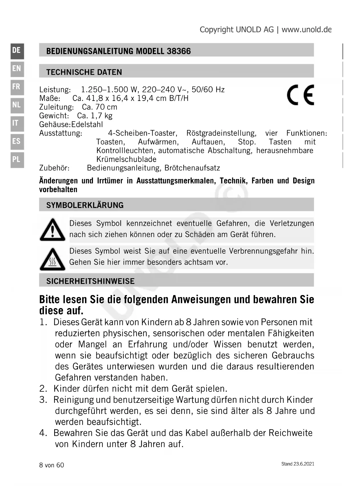 von Kindern unter 8 Jahren auf. SYMBOLERKLÄRUNG Dieses Symbol kennzeichnet eventuelle Gefahren, die Verletzungen nach sich ziehen können oder zu Schäden am Gerät führen. Dieses Symbol weist Sie auf eine eventuelle Verbrennungsgefahr hin. Gehen Sie hier immer besonders achtsam vor. Leistung: 1.250–1.500 W, 220–240 V~, 50/60 Hz Maße: Ca. 41,8 x 16,4 x 19,4 cm B/T/H Zuleitung: Ca. 70 cm Gewicht: Ca. 1,7 kg Gehäuse: Edelstahl Ausstattung: 4-Scheiben-Toaster, Röstgradeinstellung, vier Funktionen: Toasten, Aufwärmen, Auftauen, Stop. Tasten mit Kontrollleuchten, automatische Abschaltung, herausnehmbare Krümelschublade Zubehör: Bedienungsanleitung, Brötchenaufsatz Änderungen und Irrtümer in Ausstattungsmerkmalen, Technik, Farben und Design vorbehalten Copyright UNOLD AG | www.unold.de UNOLD ©Stand 23.6.2021 9 von 60