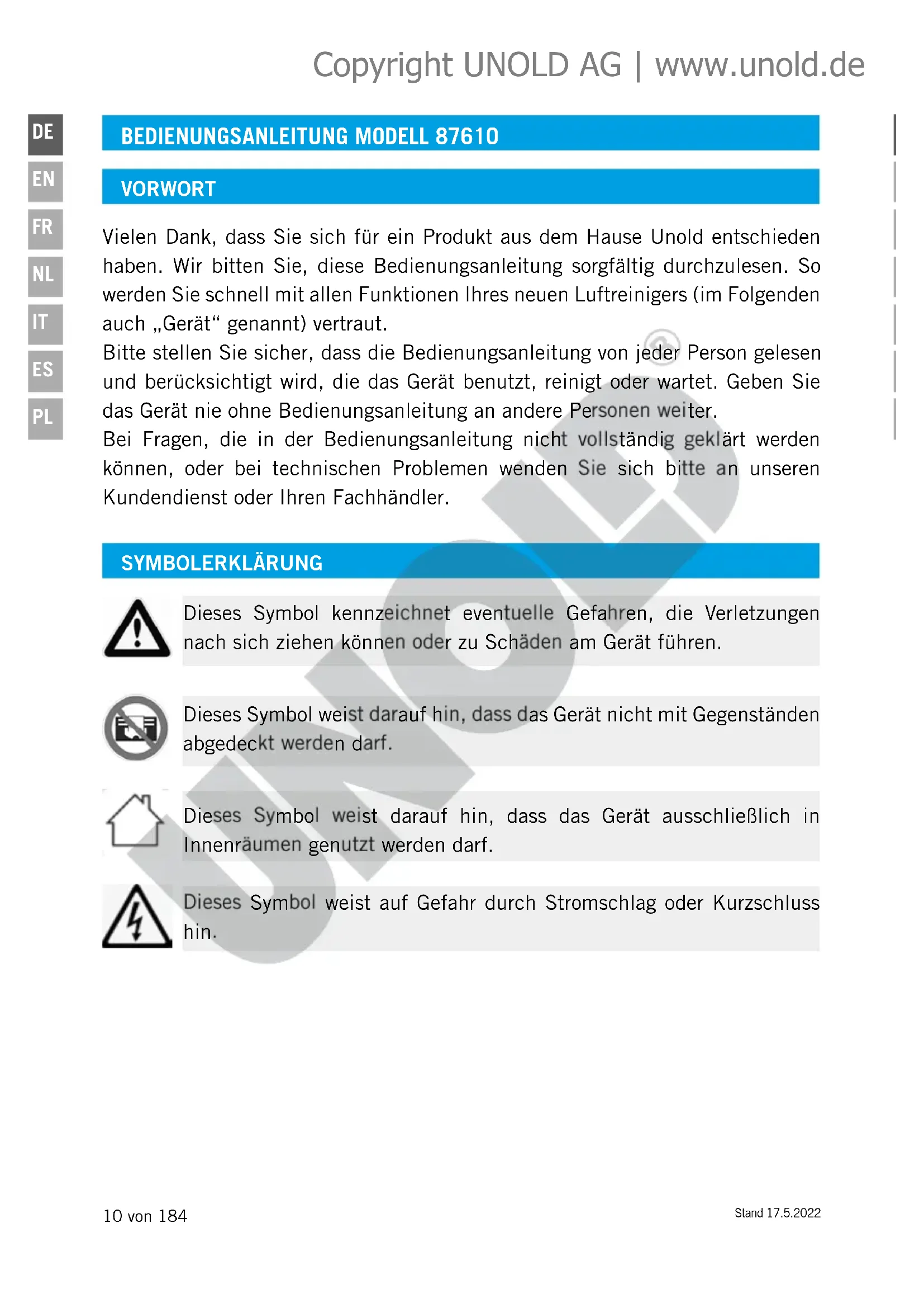BEDIENUNGSANLEITUNG MODELL 87610 VORWORT Vielen Dank, dass Sie sich für ein Produkt aus dem Hause Unold entschieden haben. Wir bitten Sie, diese Bedienungsanleitung sorgfältig durchzulesen. So werden Sie schnell mit allen Funktionen Ihres neuen Luftreinigers (im Folgenden auch „Gerät“ genannt) vertraut. Bitte stellen Sie sicher, dass die Bedienungsanleitung von jeder Person gelesen und berücksichtigt wird, die das Gerät benutzt, reinigt oder wartet. Geben Sie das Gerät nie ohne Bedienungsanleitung an andere Personen weiter. Bei Fragen, die in der Bedienungsanleitung nicht vollständig geklärt werden können, oder bei technischen Problemen wenden Sie sich bitte an unseren Kundendienst oder Ihren Fachhändler. SYMBOLERKLÄRUNG Dieses Symbol kennzeichnet eventuelle Gefahren, die Verletzungen nach sich ziehen können oder zu Schäden am Gerät führen. Dieses Symbol weist auf Gefahr durch Stromschlag oder Kurzschluss hin. Dieses Symbol weist darauf hin, dass das Gerät nicht mit Gegenständen abgedeckt werden darf. Dieses Symbol weist darauf hin, dass das Gerät ausschließlich in Innenräumen genutzt werden darf. Copyright UNOLD AG | www.unold.deStand 17.5.2022 11 von 184