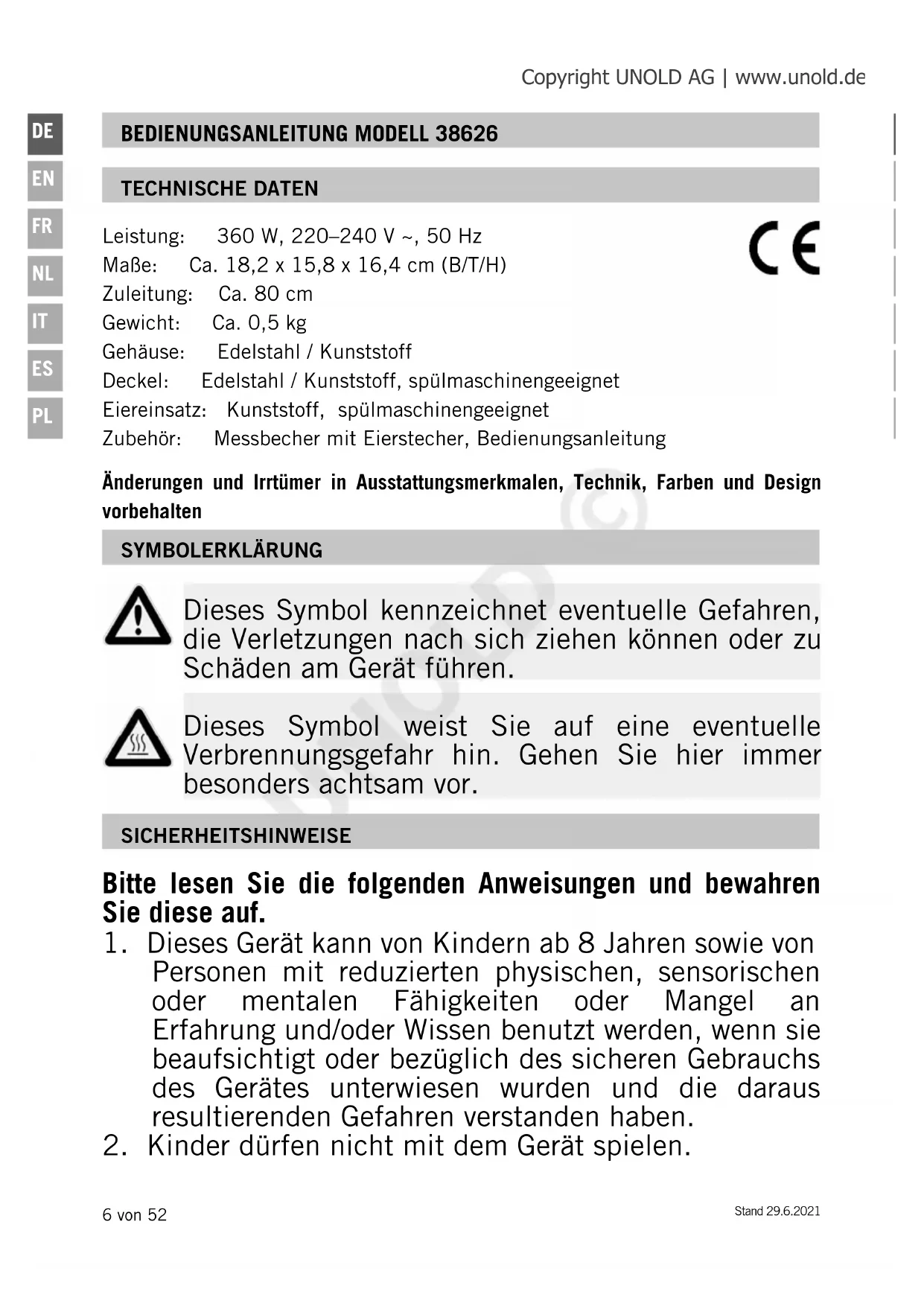 Eierkochers. Es besteht Gefahr durch Stromschlag. Copyright UNOLD AG | www.unold.de UNOLD ©Stand 29.6.2021 9 von 52