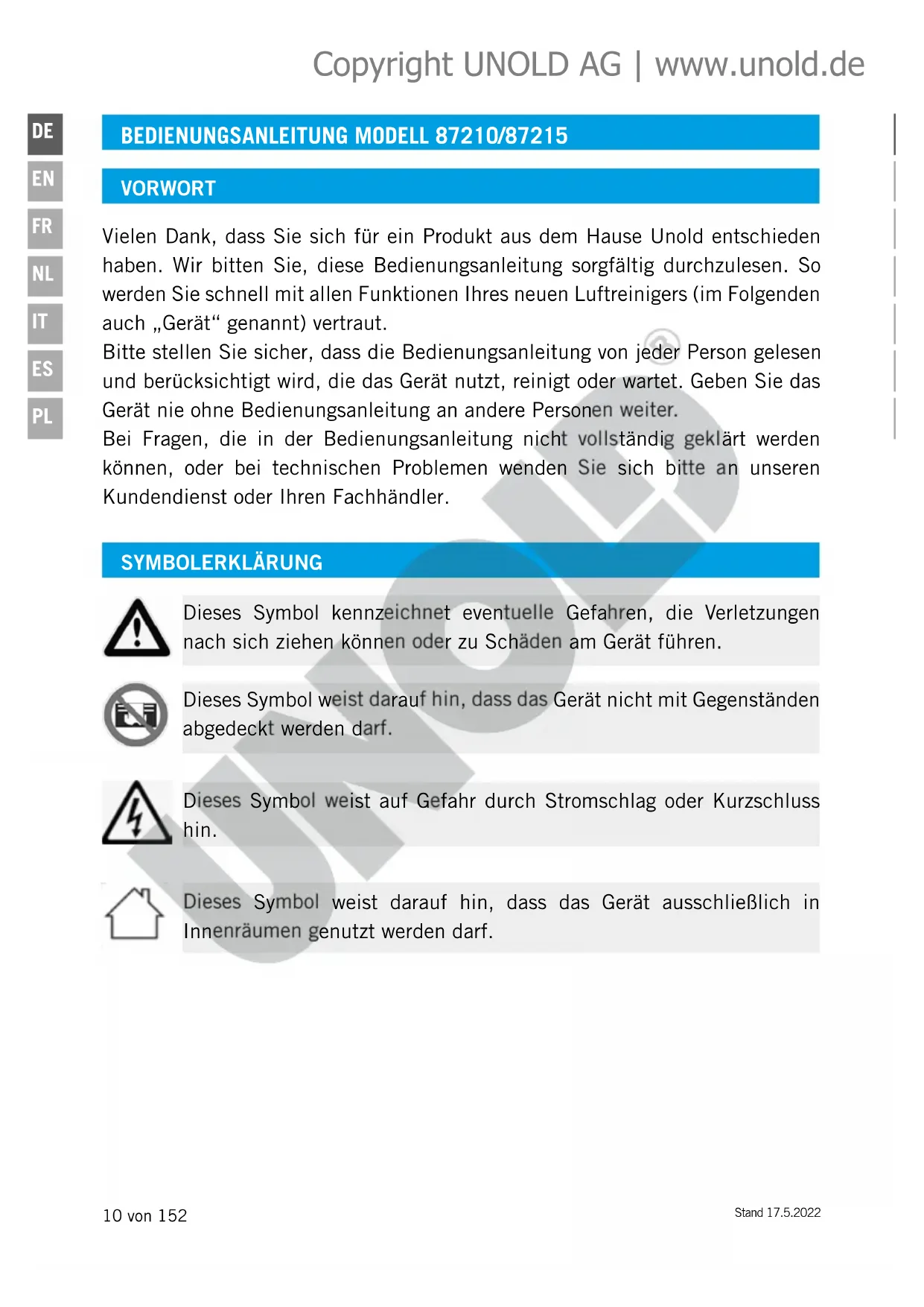 BEDIENUNGSANLEITUNG MODELL 87210/87215 VORWORT Vielen Dank, dass Sie sich für ein Produkt aus dem Hause Unold entschieden haben. Wir bitten Sie, diese Bedienungsanleitung sorgfältig durchzulesen. So werden Sie schnell mit allen Funktionen Ihres neuen Luftreinigers (im Folgenden auch „Gerät“ genannt) vertraut. Bitte stellen Sie sicher, dass die Bedienungsanleitung von jeder Person gelesen und berücksichtigt wird, die das Gerät nutzt, reinigt oder wartet. Geben Sie das Gerät nie ohne Bedienungsanleitung an andere Personen weiter. Bei Fragen, die in der Bedienungsanleitung nicht vollständig geklärt werden können, oder bei technischen Problemen wenden Sie sich bitte an unseren Kundendienst oder Ihren Fachhändler. SYMBOLERKLÄRUNG Dieses Symbol kennzeichnet eventuelle Gefahren, die Verletzungen nach sich ziehen können oder zu Schäden am Gerät führen. Dieses Symbol weist auf Gefahr durch Stromschlag oder Kurzschluss hin. Dieses Symbol weist darauf hin, dass das Gerät nicht mit Gegenständen abgedeckt werden darf. Dieses Symbol weist darauf hin, dass das Gerät ausschließlich in Innenräumen genutzt werden darf. Copyright UNOLD AG | www.unold.deStand 17.5.2022 11 von 152
