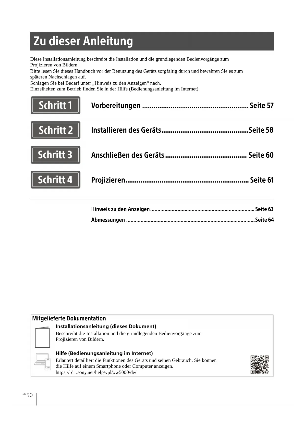 Diese Installationsanleitung beschreibt die Installation und die grundlegenden Bedienvorgänge zum Projizieren von Bildern.Bitte lesen Sie dieses Handbuch vor der Benutzung des Geräts sorgfältig durch und bewahren Sie es zum späteren Nachschlagen auf.Schlagen Sie bei Bedarf unter „Hinweis zu den Anzeigen“ nach.Einzelheiten zum Betrieb finden Sie in der Hilfe (Bedienungsanleitung im Internet). Zu dieser Anleitung Vorbereitungen ........................................................ Seite 57 Installieren des Geräts ..............................................Seite 58 Anschließen des Geräts ........................................... Seite 60 Projizieren ................................................................. Seite 61 Hinweis zu den Anzeigen......................................................................... Seite 63 Abmessungen ..........................................................................................Seite 64 Schritt 1 Schritt 2 Schritt 3 Schritt 4 Mitgelieferte Dokumentation Installationsanleitung (dieses Dokument)Beschreibt die Installation und die grundlegenden Bedienvorgänge zum Projizieren von Bildern.Hilfe (Bedienungsanleitung im Internet)Erläutert detailliert die Funktionen des Geräts und seinen Gebrauch. Sie können die Hilfe auf einem Smartphone oder Computer anzeigen.https://rd1.sony.net/help/vpl/xw5000/de/51
