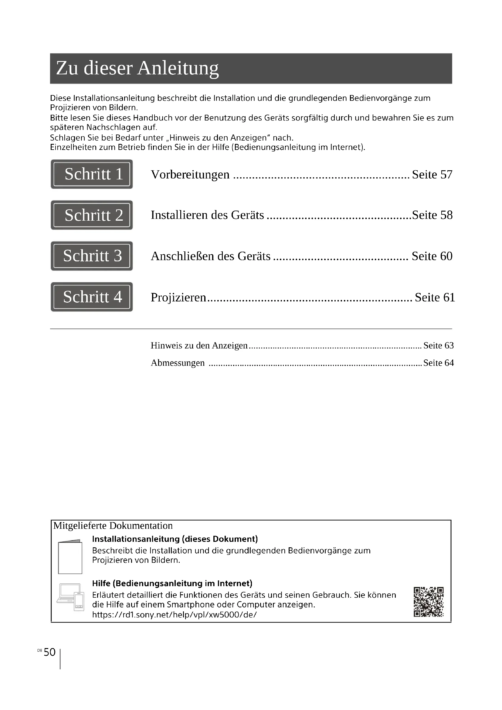Diese Installationsanleitung beschreibt die Installation und die grundlegenden Bedienvorgänge zum Projizieren von Bildern.Bitte lesen Sie dieses Handbuch vor der Benutzung des Geräts sorgfältig durch und bewahren Sie es zum späteren Nachschlagen auf.Schlagen Sie bei Bedarf unter „Hinweis zu den Anzeigen“ nach.Einzelheiten zum Betrieb finden Sie in der Hilfe (Bedienungsanleitung im Internet). Zu dieser Anleitung Vorbereitungen ........................................................ Seite 57 Installieren des Geräts ..............................................Seite 58 Anschließen des Geräts ........................................... Seite 60 Projizieren ................................................................. Seite 61 Hinweis zu den Anzeigen......................................................................... Seite 63 Abmessungen ..........................................................................................Seite 64 Schritt 1 Schritt 2 Schritt 3 Schritt 4 Mitgelieferte Dokumentation Installationsanleitung (dieses Dokument)Beschreibt die Installation und die grundlegenden Bedienvorgänge zum Projizieren von Bildern.Hilfe (Bedienungsanleitung im Internet)Erläutert detailliert die Funktionen des Geräts und seinen Gebrauch. Sie können die Hilfe auf einem Smartphone oder Computer anzeigen.https://rd1.sony.net/help/vpl/xw5000/de/51