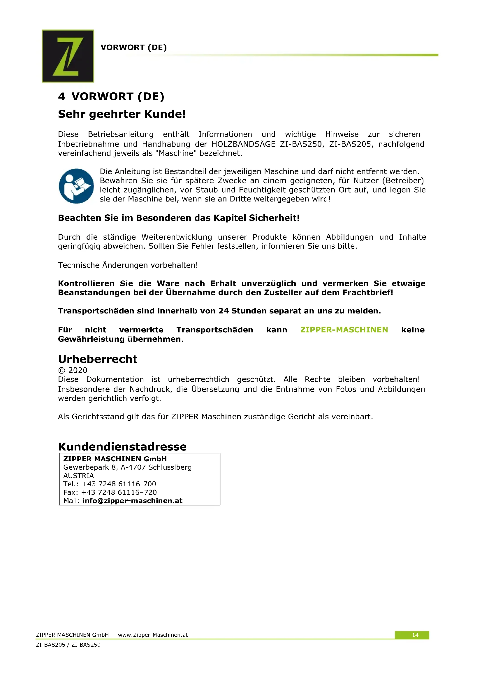 - (HR) Napomena o emisiji buke: navedene vrijednosti su vrijednosti emisije i ne moraju istovremeno predstavljati i sigurne vrijednosti na radnom mjestu. Iako postoji korelacija između razina emisije i imisije, iz toga se ne može pouzdano zaključiti jesu li ili nisu potrebne dodatne mjere opreza. Čimbenici koji utječu na stvarnu razinu imisije na radnom mjestu obuhvaćaju specifičnost radnog prostora i druge izvore buke, tj. broj strojeva i drugih radnih procesa u blizini. Dopuštene vrijednosti na radnom mjestu mogu se razlikovati i u različitim državama. Ali ove bi informacije korisniku trebale omogućiti da izvrši procjenu opasnosti i rizika.VORWORT (DE) ZIPPER MASCHINEN GmbH www.Zipper-Maschinen.at 14 ZI-BAS205 / ZI-BAS25014 4 VORWORT (DE) Sehr geehrter Kunde! Diese Betriebsanleitung enthält Informationen und wichtige Hinweise zur sicheren Inbetriebnahme und Handhabung der HOLZBANDSÄGE ZI-BAS250, ZI-BAS205, nachfolgend vereinfachend jeweils als "Maschine" bezeichnet. Die Anleitung ist Bestandteil der jeweiligen Maschine und darf nicht entfernt werden. Bewahren Sie sie für spätere Zwecke an einem geeigneten, für Nutzer (Betreiber) leicht zugänglichen, vor Staub und Feuchtigkeit geschützten Ort auf, und legen Sie sie der Maschine bei, wenn sie an Dritte weitergegeben wird! Beachten Sie im Besonderen das Kapitel Sicherheit! Durch die ständige Weiterentwicklung unserer Produkte können Abbildungen und Inhalte geringfügig abweichen. Sollten Sie Fehler feststellen, informieren Sie uns bitte. Technische Änderungen vorbehalten! Kontrollieren Sie die Ware nach Erhalt unverzüglich und vermerken Sie etwaige Beanstandungen bei der Übernahme durch den Zusteller auf dem Frachtbrief! Transportschäden sind innerhalb von 24 Stunden separat an uns zu melden. Für nicht vermerkte Transportschäden kann ZIPPER-MASCHINEN keine Gewährleistung übernehmen. Urheberrecht © 2020 Diese Dokumentation ist urheberrechtlich geschützt. Alle Rechte bleiben vorbehalten! Insbesondere der Nachdruck, die Übersetzung und die Entnahme von Fotos und Abbildungen werden gerichtlich verfolgt. Als Gerichtsstand gilt das für ZIPPER Maschinen zuständige Gericht als vereinbart.