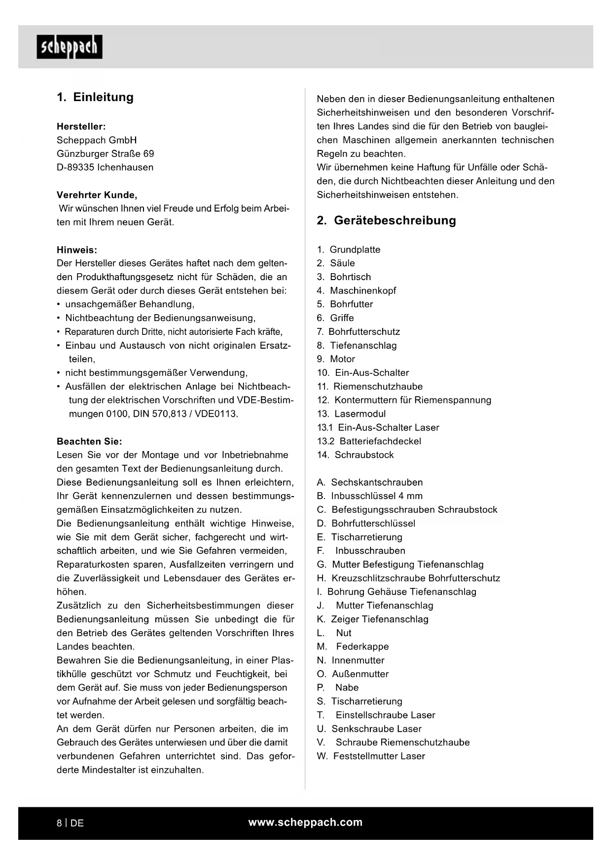 Hersteller: Scheppach GmbH Günzburger Straße 69 D-89335 Ichenhausen Verehrter Kunde, Wir wünschen Ihnen viel Freude und Erfolg beim Arbei- ten mit Ihrem neuen Gerät. Hinweis: Der Hersteller dieses Gerätes haftet nach dem gelten- den Produkthaftungsgesetz nicht für Schäden, die an diesem Gerät oder durch dieses Gerät entstehen bei: