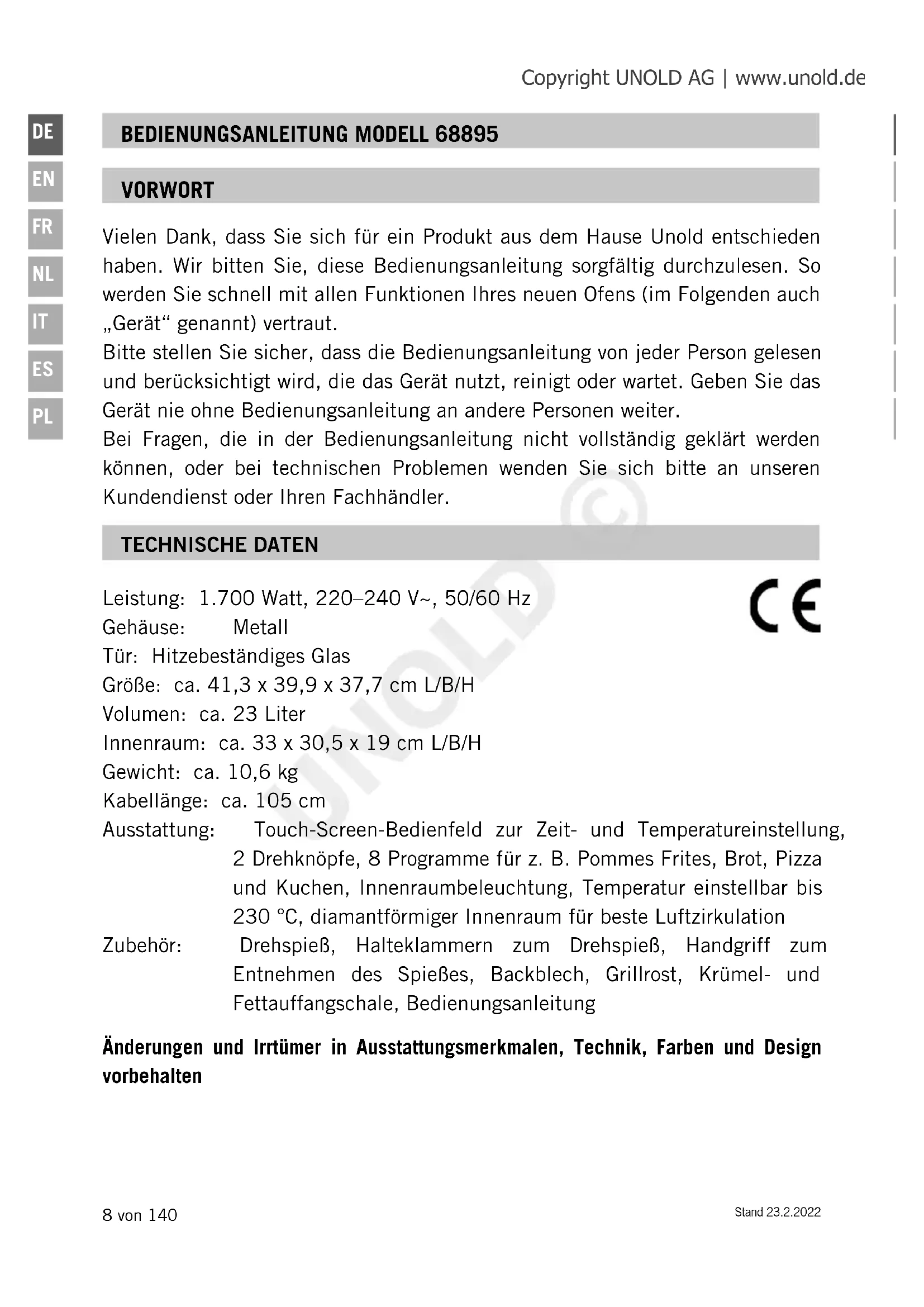 BEDIENUNGSANLEITUNG MODELL 68895 TECHNISCHE DATEN Leistung: 1.700 Watt, 220–240 V~, 50/60 Hz Gehäuse: Metall Tür: Hitzebeständiges Glas Größe: ca. 41,3 x 39,9 x 37,7 cm L/B/H Volumen: ca. 23 Liter Innenraum: ca. 33 x 30,5 x 19 cm L/B/H Gewicht: ca. 10,6 kg Kabellänge: ca. 105 cm Ausstattung: Touch-Screen-Bedienfeld zur Zeit- und Temperatureinstellung, 2 Drehknöpfe, 8 Programme für z. B. Pommes Frites, Brot, Pizza und Kuchen, Innenraumbeleuchtung, Temperatur einstellbar bis 230 °C, diamantförmiger Innenraum für beste Luftzirkulation Zubehör: Drehspieß, Halteklammern zum Drehspieß, Handgriff zum Entnehmen des Spießes, Backblech, Grillrost, Krümel- und Fettauffangschale, Bedienungsanleitung Änderungen und Irrtümer in Ausstattungsmerkmalen, Technik, Farben und Design vorbehalten VORWORT Vielen Dank, dass Sie sich für ein Produkt aus dem Hause Unold entschieden haben. Wir bitten Sie, diese Bedienungsanleitung sorgfältig durchzulesen. So werden Sie schnell mit allen Funktionen Ihres neuen Ofens (im Folgenden auch „Gerät“ genannt) vertraut. Bitte stellen Sie sicher, dass die Bedienungsanleitung von jeder Person gelesen und berücksichtigt wird, die das Gerät nutzt, reinigt oder wartet. Geben Sie das Gerät nie ohne Bedienungsanleitung an andere Personen weiter. Bei Fragen, die in der Bedienungsanleitung nicht vollständig geklärt werden können, oder bei technischen Problemen wenden Sie sich bitte an unseren Kundendienst oder Ihren Fachhändler. Copyright UNOLD AG | www.unold.de UNOLD ©Stand 23.2.2022 9 von 140