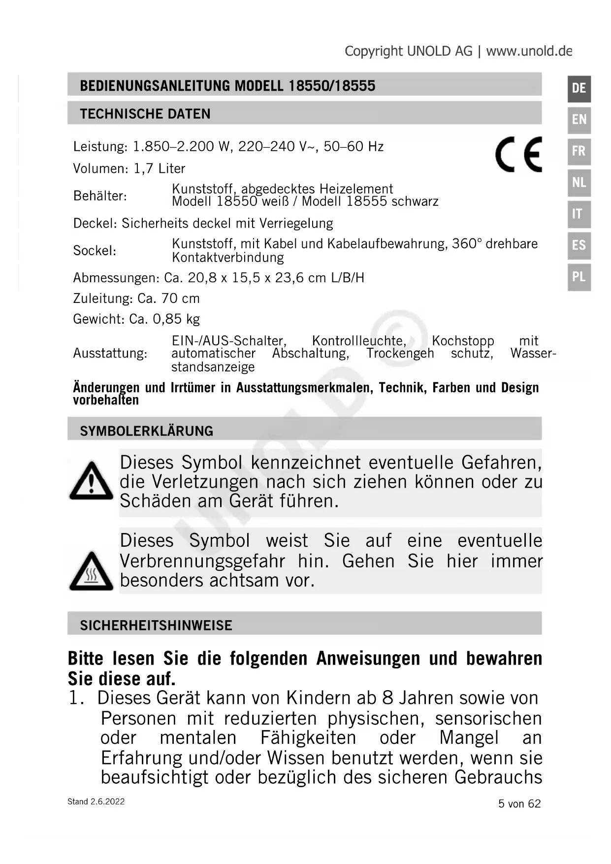 BEDIENUNGSANLEITUNG MODELL 18550/18555 TECHNISCHE DATEN Leistung: 1.850–2.200 W, 220–240 V~, 50–60 Hz Volumen: 1,7 Liter Behälter: Kunststoff, abgedecktes Heizelement Modell 18550 weiß / Modell 18555 schwarz Deckel: Sicherheits deckel mit Verriegelung Sockel: Kunststoff, mit Kabel und Kabelaufbewahrung, 360° drehbare Kontakt verbindung Abmessungen: Ca. 20,8 x 15,5 x 23,6 cm L/B/H Zuleitung: Ca. 70 cm Gewicht: Ca. 0,85 kg Ausstattung: EIN-/AUS-Schalter, Kontrollleuchte, Kochstopp mit automatischer Abschaltung, Trockengeh schutz, Wasser- standsanzeige Änderungen und Irrtümer in Ausstattungsmerkmalen, Technik, Farben und Design vorbehalten SYMBOLERKLÄRUNG Dieses Symbol kennzeichnet eventuelle Gefahren, die Verletzungen nach sich ziehen können oder zu Schäden am Gerät führen. Dieses Symbol weist Sie auf eine eventuelle Verbrennungsgefahr hin. Gehen Sie hier immer besonders achtsam vor. SICHERHEITSHINWEISE Bitte lesen Sie die folgenden Anweisungen und bewahren Sie diese auf.