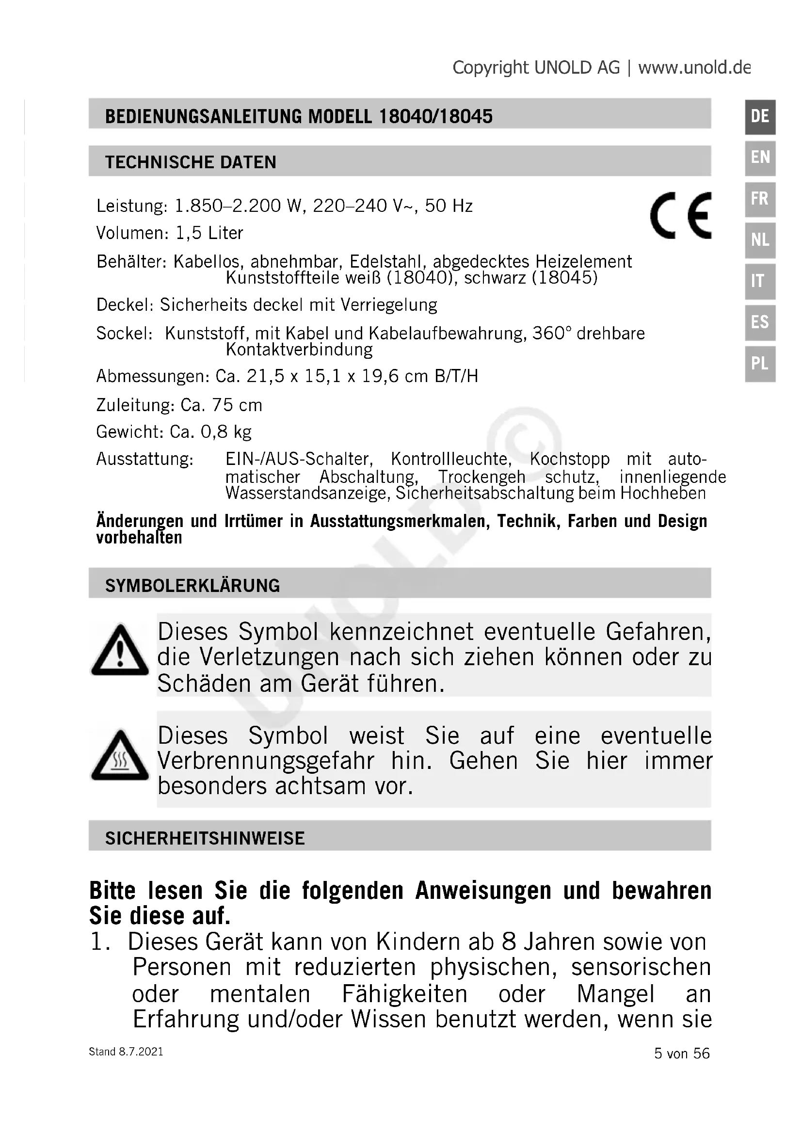 BEDIENUNGSANLEITUNG MODELL 18040/18045 TECHNISCHE DATEN Leistung: 1.850–2.200 W, 220–240 V~, 50 Hz Volumen: 1,5 Liter Behälter: Kabellos, abnehmbar, Edelstahl, abgedecktes Heizelement Kunststoffteile weiß (18040), schwarz (18045) Deckel: Sicherheits deckel mit Verriegelung Sockel: Kunststoff, mit Kabel und Kabelaufbewahrung, 360° drehbare Kontakt verbindung Abmessungen: Ca. 21,5 x 15,1 x 19,6 cm B/T/H Zuleitung: Ca. 75 cm Gewicht: Ca. 0,8 kg Ausstattung: EIN-/AUS-Schalter, Kontrollleuchte, Kochstopp mit auto- matischer Abschaltung, Trockengeh schutz, innenliegende Wasserstandsanzeige, Sicherheitsabschaltung beim Hochheben Änderungen und Irrtümer in Ausstattungsmerkmalen, Technik, Farben und Design vorbehalten SYMBOLERKLÄRUNG Dieses Symbol kennzeichnet eventuelle Gefahren, die Verletzungen nach sich ziehen können oder zu Schäden am Gerät führen. Dieses Symbol weist Sie auf eine eventuelle Verbrennungsgefahr hin. Gehen Sie hier immer besonders achtsam vor. SICHERHEITSHINWEISE Bitte lesen Sie die folgenden Anweisungen und bewahren Sie diese auf.