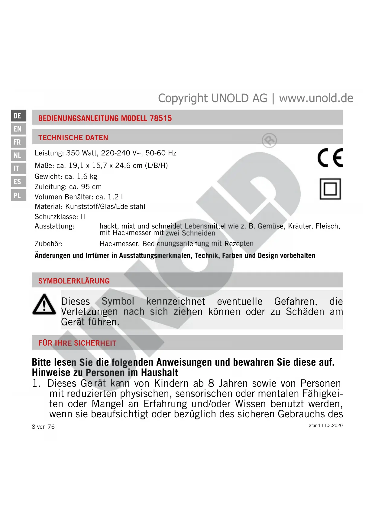Finden Sie kostenlos die Bedienungsanleitung des Geräts Multi 78515 UNOLD als PDF.