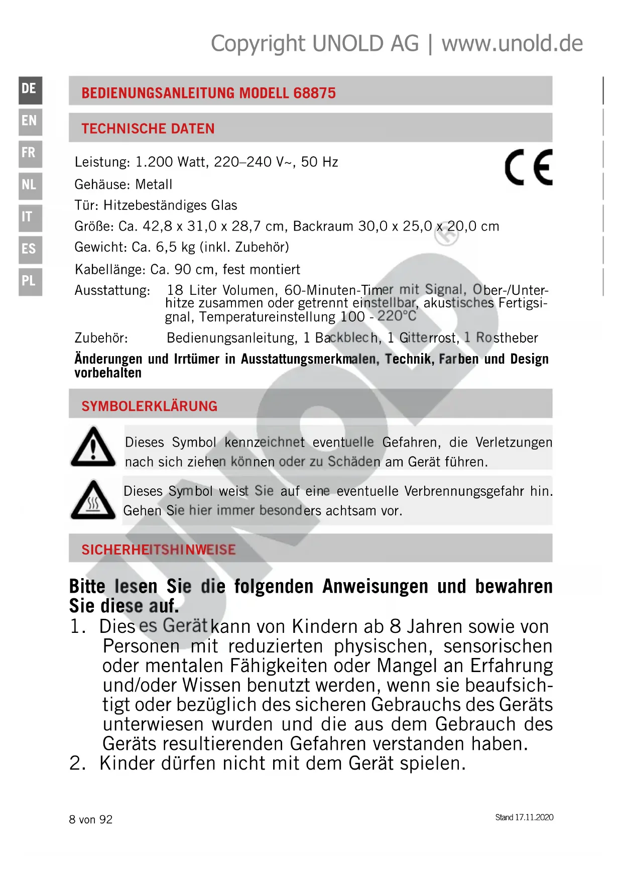 Hiermit erklart die UNOLD AG, dass sich der Ofen 68875 in Übereinstimmung mit den grundlegenden Anforderungen der europäischen Richtlinie für elektronische Verträge (2014/30/EU) und der Niederspannungsrichtlinie (2014/35/EU) befindet Hiermit bestätigt die UNOLD AG, dass sowohl das Produkt als auch die eingesetzten Rohstoffe den Vorschriften des LFBG § 30 u. § 31 und der EU-Anordnung 1935/2004, Art. 3, § 1 in ihrer jeweils aktuellen Fassung entspricht. Die gesetzlichen Grenzwerte werden eingehalten.