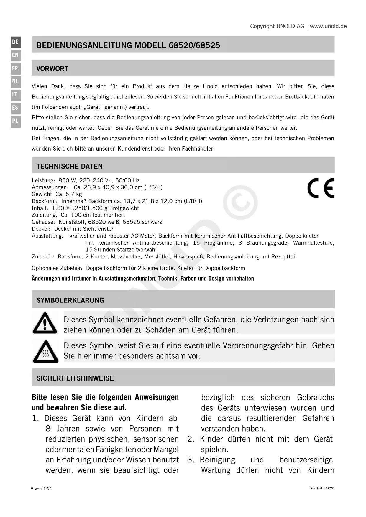 Wartung dürfen nicht von Kindern Leistung: 850 W, 220–240 V~, 50/60 Hz Abmessungen: Ca. 26,9 x 40,9 x 30,0 cm (L/B/H) Gewicht Ca. 5,7 kg Backform: Innenmaß Backform ca. 13,7 x 21,8 x 12,0 cm (L/B/H) Inhalt: 1.000/1.250/1.500 g Brotgewicht Zuleitung: Ca. 100 cm fest montiert Gehäuse: Kunststoff, 68520 weiß; 68525 schwarz Deckel: Deckel mit Sichtfenster Ausstattung: kraftvoller und robuster AC-Motor, Backform mit keramischer Antihaftbeschichtung, Doppelkneter mit keramischer Antihaftbeschichtung, 15 Programme, 3 Bräunungsgrade, Warmhaltestufe, 15 Stunden Startzeitvorwahl Zubehör: Backform, 2 Kneter, Messbecher, Messlöffel, Hakenspieß, Bedienungsanleitung mit Rezeptteil Optionales Zubehör: Doppelbackform für 2 kleine Brote, Kneter für Doppelbackform Änderungen und Irrtümer in Ausstattungsmerkmalen, Technik, Farben und Design vorbehalten SYMBOLERKLÄRUNG Dieses Symbol kennzeichnet eventuelle Gefahren, die Verletzungen nach sich ziehen können oder zu Schäden am Gerät führen. Dieses Symbol weist Sie auf eine eventuelle Verbrennungsgefahr hin. Gehen Sie hier immer besonders achtsam vor. VORWORT Vielen Dank, dass Sie sich für ein Produkt aus dem Hause Unold entschieden haben. Wir bitten Sie, diese Bedienungsanleitung sorgfältig durchzulesen. So werden Sie schnell mit allen Funktionen Ihres neuen Brotbackautomaten (im Folgenden auch „Gerät“ genannt) vertraut. Bitte stellen Sie sicher, dass die Bedienungsanleitung von jeder Person gelesen und berücksichtigt wird, die das Gerät nutzt, reinigt oder wartet. Geben Sie das Gerät nie ohne Bedienungsanleitung an andere Personen weiter. Bei Fragen, die in der Bedienungsanleitung nicht vollständig geklärt werden können, oder bei technischen Problemen wenden Sie sich bitte an unseren Kundendienst oder Ihren Fachhändler. Copyright UNOLD AG | www.unold.de UNOLD ©Stand 31.3.2022 9 von 152