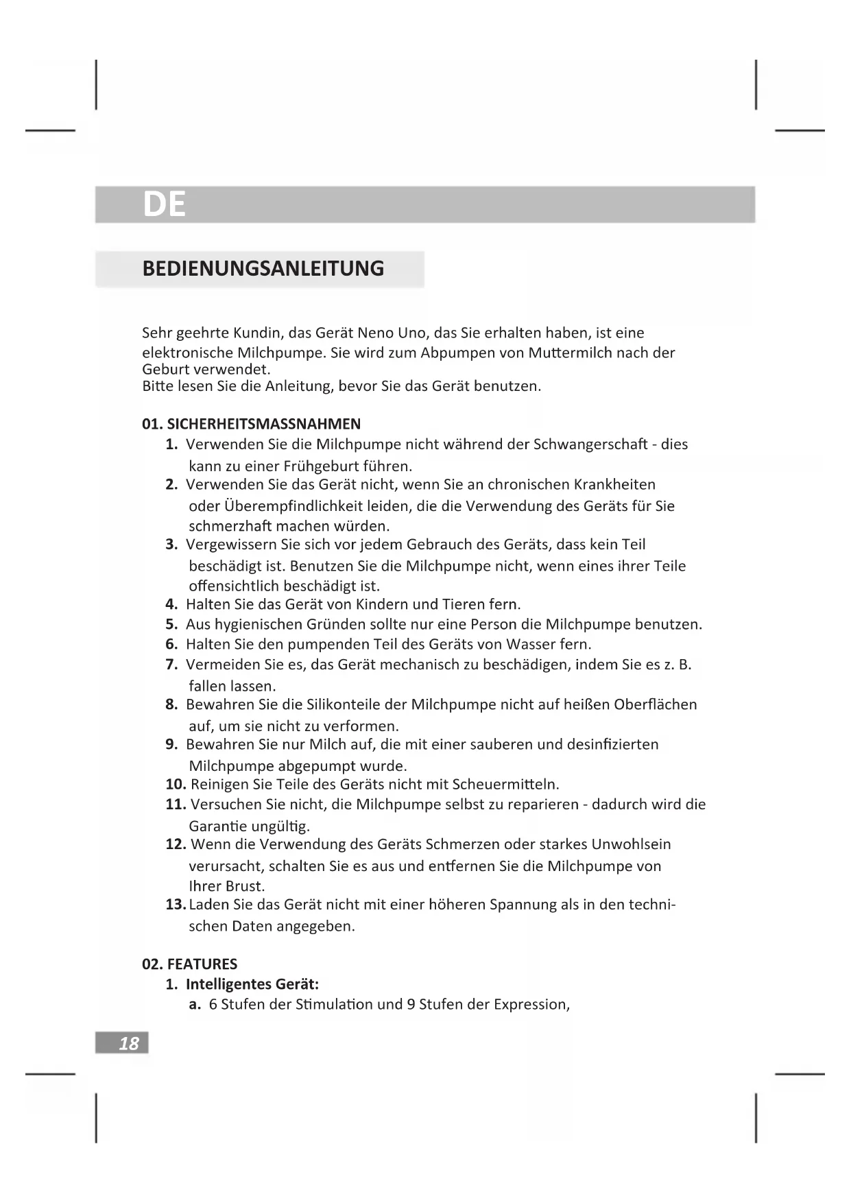 BEDIENUNGSANLEITUNG Sehr geehrte Kundin, das Gerät Neno Uno, das Sie erhalten haben, ist eine elektronische Milchpumpe. Sie wird zum Abpumpen von Muermilch nach der Geburt verwendet. Bie lesen Sie die Anleitung, bevor Sie das Gerät benutzen.