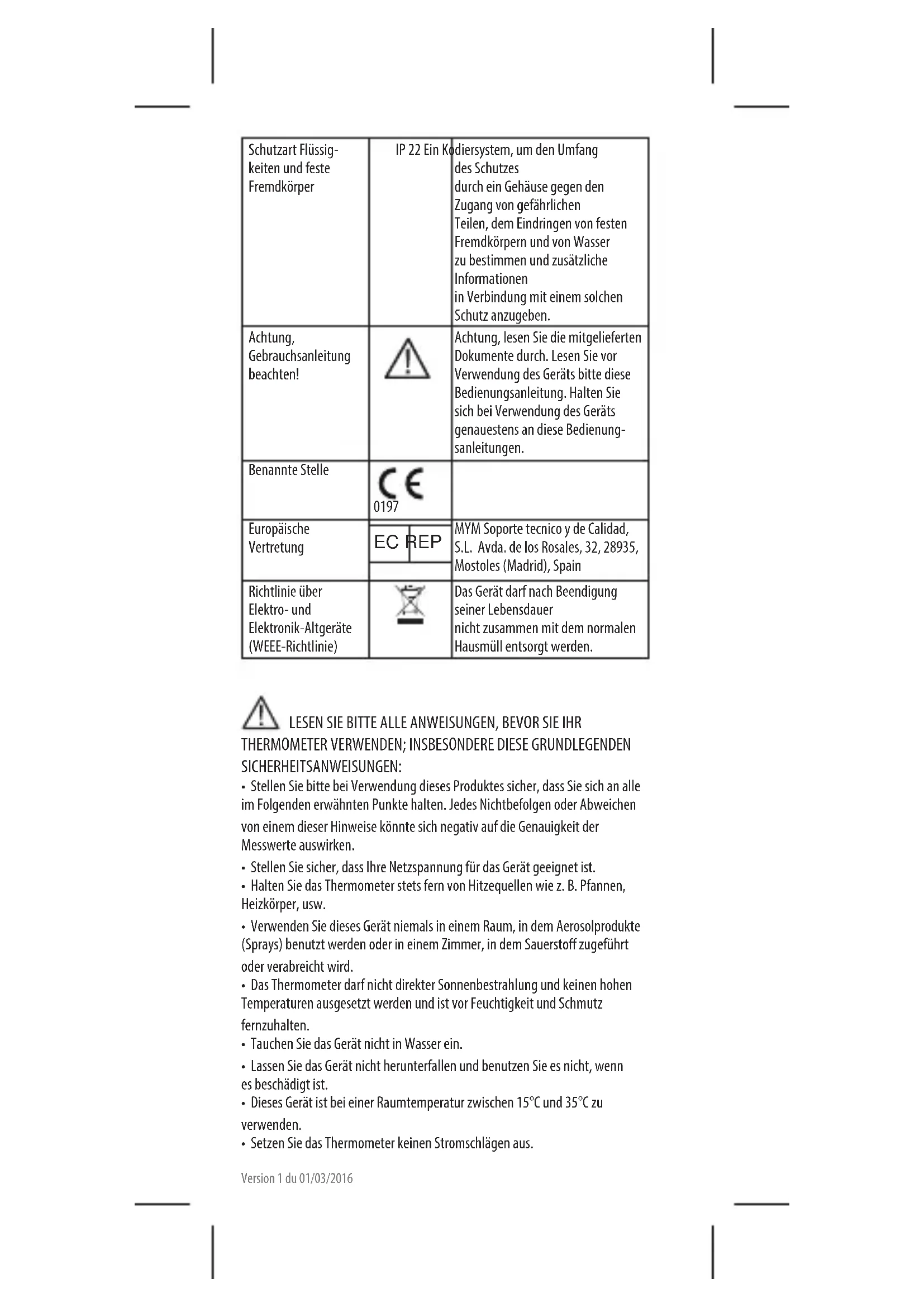 - Setzen Sie das Thermometer keinen Stromschlägen aus.Version 1 du 01/03/2016