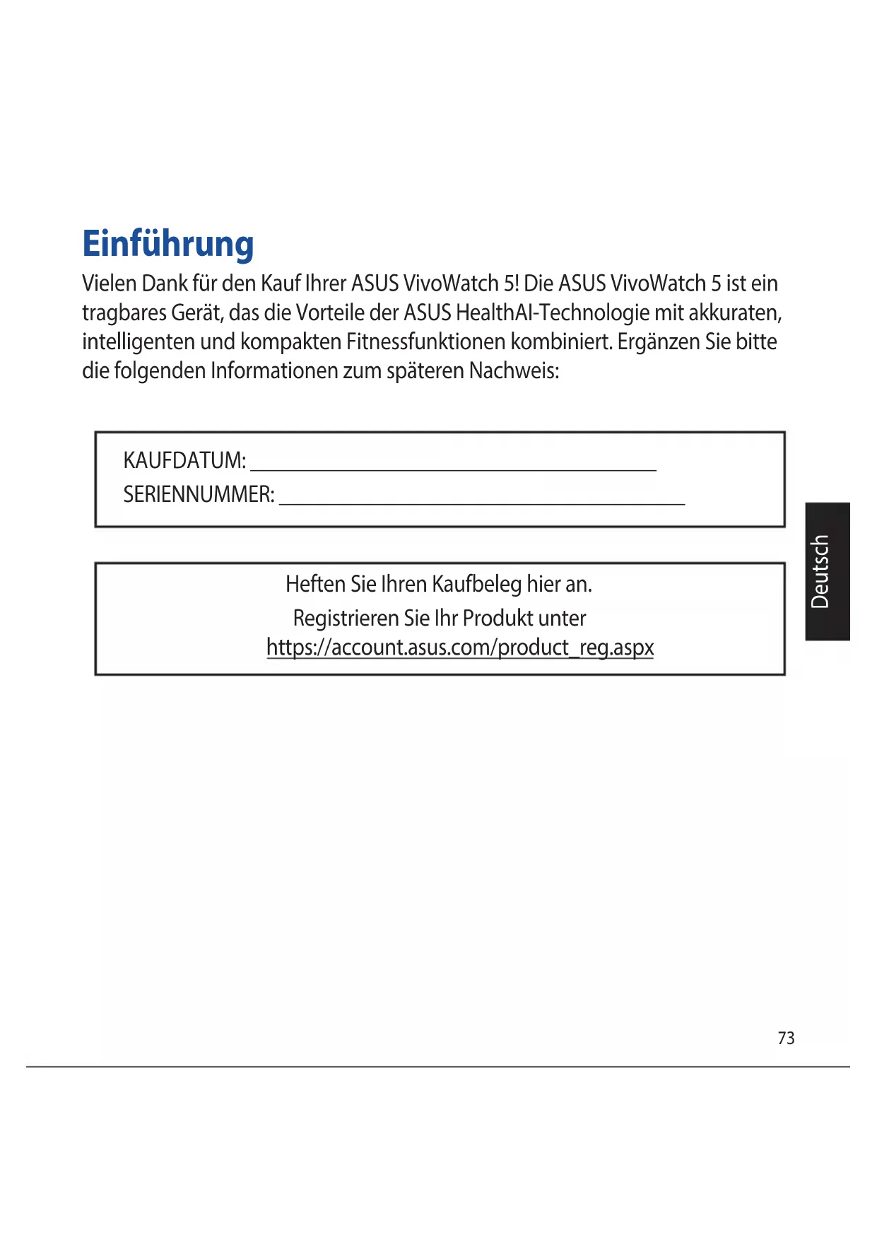 Vérifier les mises à jour pour vérifier si votre version actuelle est la plus récente.73 Deutsch Einführung Vielen Dank für den Kauf Ihrer ASUS VivoWatch 5! Die ASUS VivoWatch 5 ist ein tragbares Gerät, das die Vorteile der ASUS HealthAI-Technologie mit akkuraten, intelligenten und kompakten Fitnessfunktionen kombiniert. Ergänzen Sie bitte die folgenden Informationen zum späteren Nachweis: KAUFDATUM: ______________________________________ SERIENNUMMER: ______________________________________ Heften Sie Ihren Kaufbeleg hier an. Registrieren Sie Ihr Produkt unter https://account.asus.com/product_reg.aspx74 Deutsch Über dieses Handbuch Diese Anleitung liefert Informationen über die Hardware- und Softwaremerk- male Ihrer ASUS VivoWatch 5, geordnet in folgenden Kapiteln: Kapitel 1: Erste Schritte Dieses Kapitel beschreibt die Hardware-Komponenten Ihrer ASUS VivoWatch 5 und legt dar, wie Sie die verschiedenen Bestandteile Ihrer ASUS VivoWatch 5 benutzen. Kapitel 2: Ihre ASUS VivoWatch 5 verwenden Dieses Kapitel bietet eine Übersicht zur Nutzung Ihrer ASUS VivoWatch 5. Anhang Dieser Abschnitt enthält Hinweise zu Ihrer ASUS VivoWatch 5. Lesen Sie alle Informationen in der Bedienungsanleitung und mögli- che weitere Hinweiszettel im Paket, bevor Sie das Gerät in Betrieb nehmen. Für die vollständige Handbuchversion zu Ihrer ASUS VivoWatch 5 besuchen Sie unsere mehrsprachige Webseite unter: https://www.asus.com/Mobile/Wearable-Healthcare/Vivo- Watch/ASUS-VivoWatch-5-HC-B05/HelpDesk_Manual/75 Deutsch Anmerkungen zu diesem Handbuch Zum Hervorheben wichtiger Informationen sind manche Textabschnitte in die- sem Handbuch wie folgt gekennzeichnet: Diese Meldung enthält wichtige Informationen, denen Sie folgen müssen, um die Aufgabe fertigzustellen. Diese Meldung enthält zusätzliche Informationen und Tipps, die Ihnen bei der Fertigstellung einer Aufgabe helfen können. Diese Mitteilung enthält wichtige Informationen, die zur Gewähr- leistung Ihrer Sicherheit bei der Durchführung von Aufgaben und zur Verhinderung von Schäden an den Daten und Komponenten Ihrer ASUS VivoWatch 5 befolgt werden müssen. Typographie Fett = Diese Schriftart zeigt Ihnen ein Menü oder ein Element, welches ausgewählt werden muss. KURSIV = Diese Schriftart zeigt an, dass Sie sich auf einen bestimmten Ab- schnitt in diesem Handbuch beziehen können.76 Deutsch Sicherheitshinweise