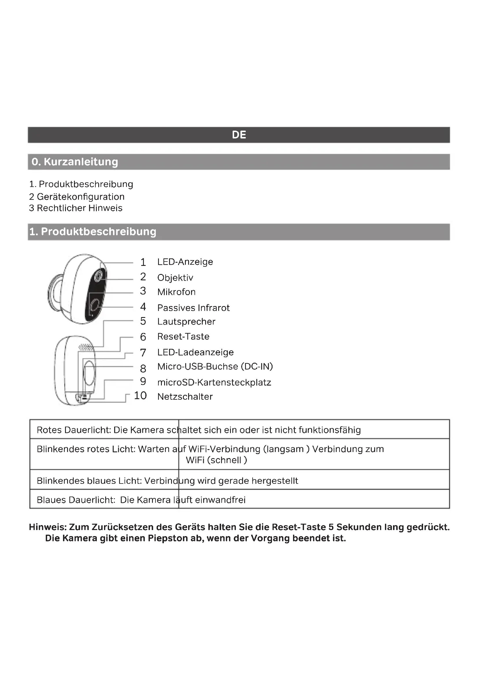2 Gerätekonguration 3 Rechtlicher Hinweis LED-Anzeige Objektiv Mikrofon Passives Infrarot Lautsprecher Reset-Taste LED-Ladeanzeige Micro-USB-Buchse (DC-IN) microSD-Kartensteckplatz Netzschalter