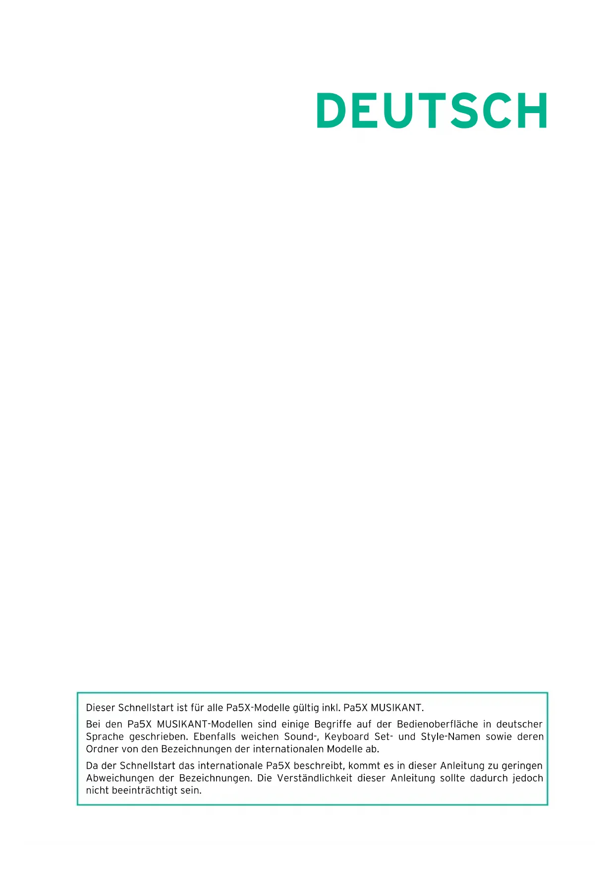 - Consult the dealer or an experienced radio/ TV technician for help. If items such as cables are included with this equipment, you must use those included items. Unauthorized changes or modification to this system can void the user’s authority to ope- rate this equipment. DÉCLARATION DE CONFORMITÉ (ÉTATS-UNIS) Responsible Party: KORG USA INC. Address: 316 SOUTH SERVICE ROAD, MELVILLE Telephone: 1-631-390-6500 Equipment Type: Professional Arranger Model: Pa5X This device complies with Part 15 of FCC Rules. Operation is subject to the following two conditions: (1) This device may not cause harmful interference, and (2) this device must accept any interference received, including interference that may cause undesired ope- ration.DEUTSCH Dieser Schnellstart ist für alle Pa5X-Modelle gültig inkl. Pa5X MUSIKANT. Bei den Pa5X MUSIKANT-Modellen sind einige Begriffe auf der Bedienoberfläche in deutscher Sprache geschrieben. Ebenfalls weichen Sound-, Keyboard Set- und Style-Namen sowie deren Ordner von den Bezeichnungen der internationalen Modelle ab. Da der Schnellstart das internationale Pa5X beschreibt, kommt es in dieser Anleitung zu geringen Abweichungen der Bezeichnungen. Die Verständlichkeit dieser Anleitung sollte dadurch jedoch nicht beeinträchtigt sein.2 | Wichtige Sicherheitshinweise