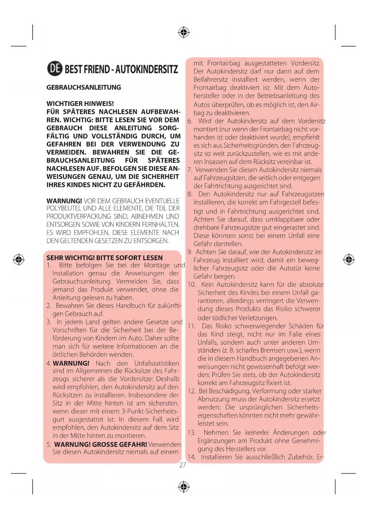 mals auf einem mit Frontairbag ausgestat- teten Vordersitz, sondern nur, wenn der Frontairbag deaktiviert ist: Mit dem Auto- hersteller oder in der Betriebsanleitung Ih- res Autos überprüfen, ob es möglich ist, den Airbag zu deaktivieren. WARNUNG! Bei Verwendung in Fahrzeugen, die auf der hinteren Sitzbank mit Sicherheits- gurten mit integrierten Airbags ausgestattet sind (aufblasbare Gurte), kann die Wechselwir- kung zwischen dem aufblasbaren Teil des Fahr- zeuggurts und dieser Rückhalteeinrichtung für Kinder schwere oder sogar tödliche Verletzun- gen bewirken. Montieren Sie diese Rückhalte- einrichtung für Kinder nicht, wenn Sie einen aufblasbaren Sicherheitsgurt verwenden. Wenn der Autokindersitz BEST FRIEND mit Sitz- verkleinerer ausgestattet ist: WARNUNG! Um die maximale Sicherheit des Kin- des zu gewährleisten, niemals den Sitzverkleinerer benutzen, wenn das Kind über 6 kg wiegt.