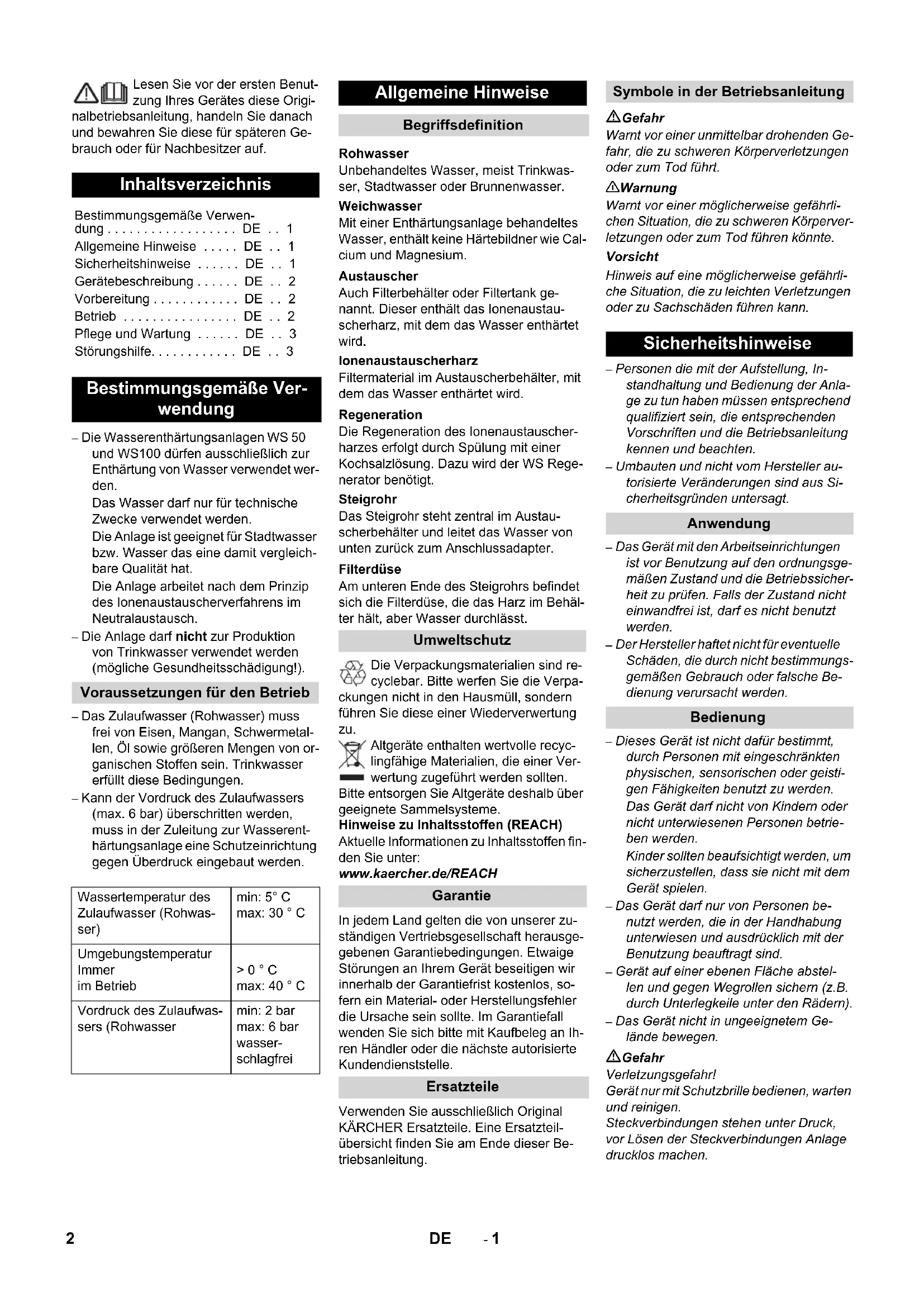• www.kaercher.com/register-and-win WS 50 WS 100 59650670 08/13 Deutsch 2 English 5 Français 8 Italiano 12 Nederlands 15 Español 18 Português 21 Dansk 24 Norsk 27 Svenska 30 Suomi 33 Ελληνικά 36 Türkçe 40 Русский 43 Magyar 47 Čeština 50 Slovenščina 53 Polski 56 Româneşte 60 Slovenčina 63 Hrvatski 66 Srpski 69 Български 72 Eesti 76 Latviešu 79 Lietuviškai 82 Українська 85- 1 Lesen Sie vor der ersten Benut- zung Ihres Gerätes diese Origi- nalbetriebsanleitung, handeln Sie danach und bewahren Sie diese für späteren Ge- brauch oder für Nachbesitzer auf. – Die Wasserenthärtungsanlagen WS 50 und WS100 dürfen ausschließlich zur Enthärtung von Wasser verwendet wer- den. Das Wasser darf nur für technische Zwecke verwendet werden. Die Anlage ist geeignet für Stadtwasser bzw. Wasser das eine damit vergleich- bare Qualität hat. Die Anlage arbeitet nach dem Prinzip des Ionenaustauscherverfahrens im Neutralaustausch. – Die Anlage darf nicht zur Produktion von Trinkwasser verwendet werden (mögliche Gesundheitsschädigung!). – Das Zulaufwasser (Rohwasser) muss frei von Eisen, Mangan, Schwermetal- len, Öl sowie größeren Mengen von or- ganischen Stoffen sein. Trinkwasser erfüllt diese Bedingungen. – Kann der Vordruck des Zulaufwassers (max. 6 bar) überschritten werden, muss in der Zuleitung zur Wasserent- härtungsanlage eine Schutzeinrichtung gegen Überdruck eingebaut werden. Unbehandeltes Wasser, meist Trinkwas- ser, Stadtwasser oder Brunnenwasser. Mit einer Enthärtungsanlage behandeltes Wasser, enthält keine Härtebildner wie Cal- cium und Magnesium. Auch Filterbehälter oder Filtertank ge- nannt. Dieser enthält das Ionenaustau- scherharz, mit dem das Wasser enthärtet wird. Filtermaterial im Austauscherbehälter, mit dem das Wasser enthärtet wird. Die Regeneration des Ionenaustauscher- harzes erfolgt durch Spülung mit einer Kochsalzlösung. Dazu wird der WS Rege- nerator benötigt. Das Steigrohr steht zentral im Austau- scherbehälter und leitet das Wasser von unten zurück zum Anschlussadapter. Am unteren Ende des Steigrohrs befindet sich die Filterdüse, die das Harz im Behäl- ter hält, aber Wasser durchlässt. Die Verpackungsmaterialien sind re- cyclebar. Bitte werfen Sie die Verpa- ckungen nicht in den Hausmüll, sondern führen Sie diese einer Wiederverwertung zu. Altgeräte enthalten wertvolle recyc- lingfähige Materialien, die einer Ver- wertung zugeführt werden sollten. Bitte entsorgen Sie Altgeräte deshalb über geeignete Sammelsysteme. Hinweise zu Inhaltsstoffen (REACH) Aktuelle Informationen zu Inhaltsstoffen fin- den Sie unter: www.kaercher.de/REACH In jedem Land gelten die von unserer zu- ständigen Vertriebsgesellschaft herausge- gebenen Garantiebedingungen. Etwaige Störungen an Ihrem Gerät beseitigen wir innerhalb der Garantiefrist kostenlos, so- fern ein Material- oder Herstellungsfehler die Ursache sein sollte. Im Garantiefall wenden Sie sich bitte mit Kaufbeleg an Ih- ren Händler oder die nächste autorisierte Kundendienststelle. Verwenden Sie ausschließlich Original KÄRCHER Ersatzteile. Eine Ersatzteil- übersicht finden Sie am Ende dieser Be- triebsanleitung. Gefahr Warnt vor einer unmittelbar drohenden Ge- fahr, die zu schweren Körperverletzungen oder zum Tod führt. 몇 Warnung Warnt vor einer möglicherweise gefährli- chen Situation, die zu schweren Körperver- letzungen oder zum Tod führen könnte. Vorsicht Hinweis auf eine möglicherweise gefährli- che Situation, die zu leichten Verletzungen oder zu Sachschäden führen kann. – Personen die mit der Aufstellung, In- standhaltung und Bedienung der Anla- ge zu tun haben müssen entsprechend qualifiziert sein, die entsprechenden Vorschriften und die Betriebsanleitung kennen und beachten. – Umbauten und nicht vom Hersteller au- torisierte Veränderungen sind aus Si- cherheitsgründen untersagt. – Das Gerät mit den Arbeitseinrichtungen ist vor Benutzung auf den ordnungsge- mäßen Zustand und die Betriebssicher- heit zu prüfen. Falls der Zustand nicht einwandfrei ist, darf es nicht benutzt werden. – Der Hersteller haftet nicht für eventuelle Schäden, die durch nicht bestimmungs- gemäßen Gebrauch oder falsche Be- dienung verursacht werden. – Dieses Gerät ist nicht dafür bestimmt, durch Personen mit eingeschränkten physischen, sensorischen oder geisti- gen Fähigkeiten benutzt zu werden. Das Gerät darf nicht von Kindern oder nicht unterwiesenen Personen betrie- ben werden. Kinder sollten beaufsichtigt werden, um sicherzustellen, dass sie nicht mit dem Gerät spielen. – Das Gerät darf nur von Personen be- nutzt werden, die in der Handhabung unterwiesen und ausdrücklich mit der Benutzung beauftragt sind. – Gerät auf einer ebenen Fläche abstel- len und gegen Wegrollen sichern (z.B. durch Unterlegkeile unter den Rädern). – Das Gerät nicht in ungeeignetem Ge- lände bewegen. Gefahr Verletzungsgefahr! Gerät nur mit Schutzbrille bedienen, warten und reinigen. Steckverbindungen stehen unter Druck, vor Lösen der Steckverbindungen Anlage drucklos machen. Inhaltsverzeichnis Bestimmungsgemäße Verwen- dung