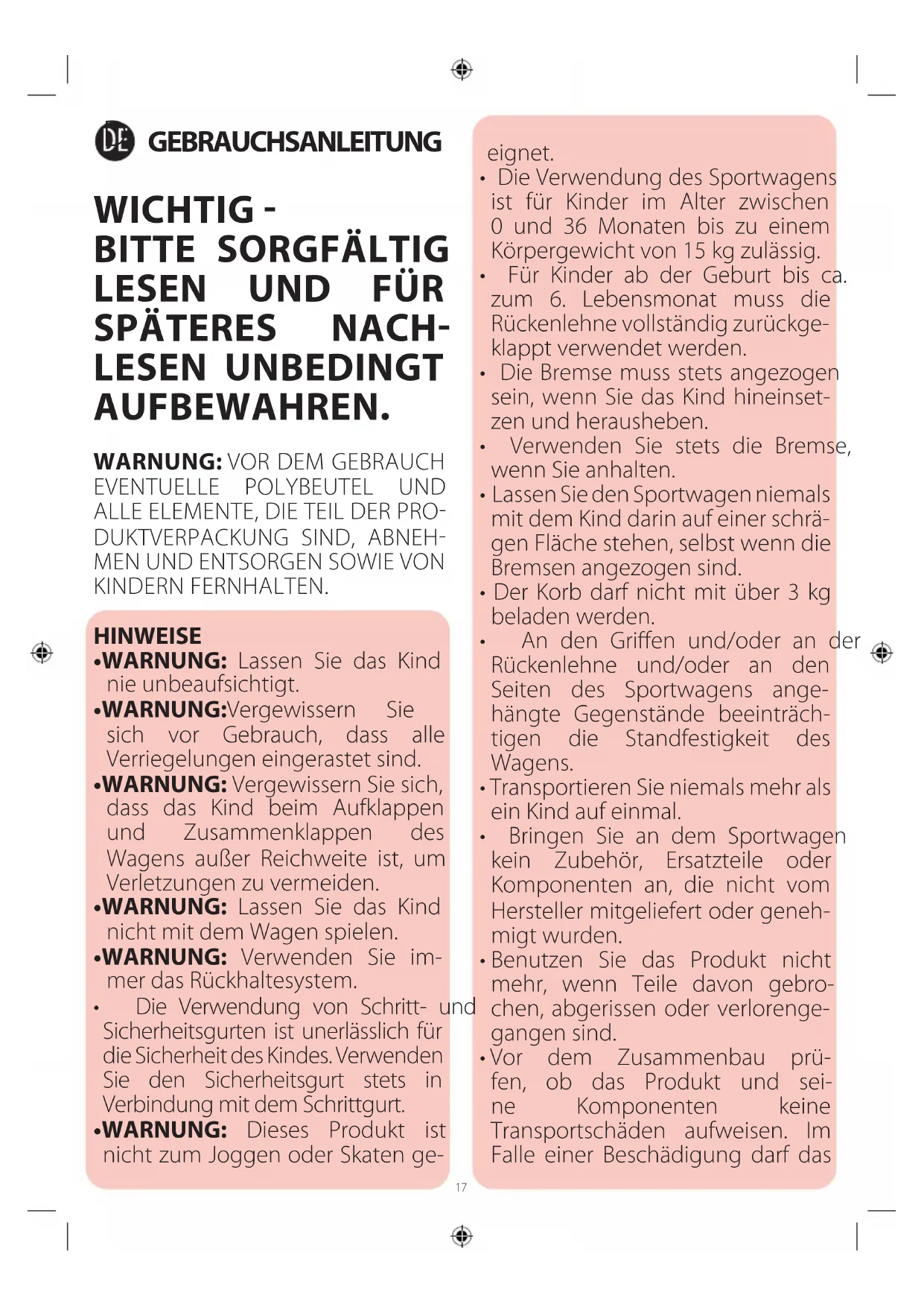 - Die Verwendung des Sportwagens ist für Kinder im Alter zwischen 0 und 36 Monaten bis zu einem Körpergewicht von 15 kg zulässig.