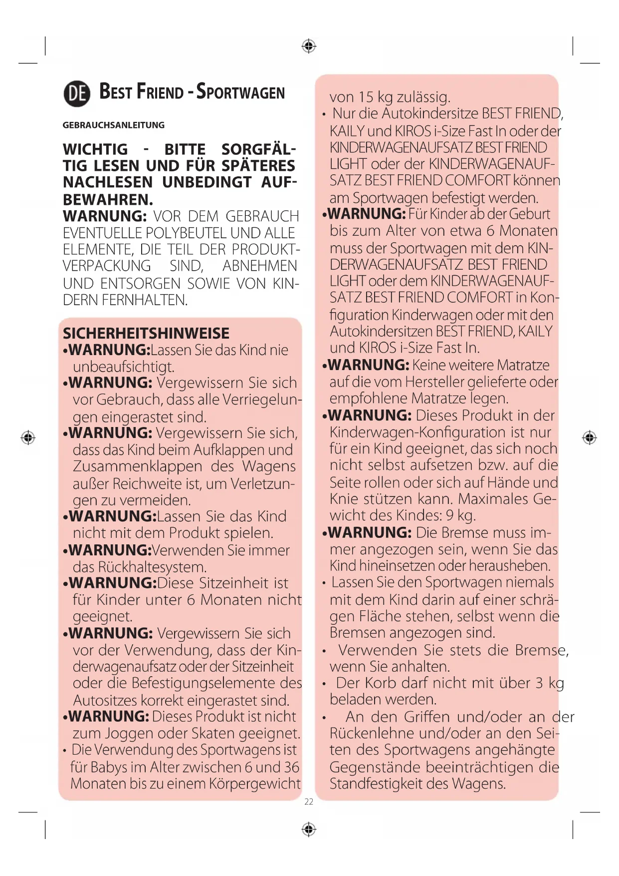 - WARNUNG: Dieses Produkt in der Kinderwagen-Konfiguration ist nur für ein Kind geeignet, das sich noch nicht selbst aufsetzen bzw. auf die Seite rollen oder sich auf Hände und Knie stützen kann. Maximales Ge- wicht des Kindes: 9 kg.