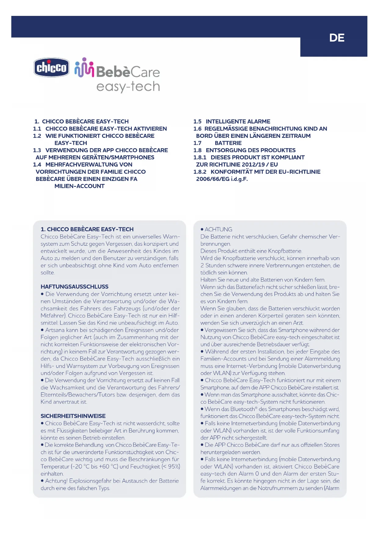 Falls das Kind länger als 30 Minuten auf dem Autokindersitz mit aktiviertem Chicco BebèCare Easy-Tech sitzt, erscheint auf dem Smartphone eine Push-Benachrichtigung, begleitet von einem kurzen akustischen Signal. Nur das akustische Signal kann vom Benutzer über die Maske “Setting/Benachrichtigungen” deaktiviert werden.gung ihres Lebenszyklus getrennt vom Hausmüll gesam- melt und entsorgt werden müssen. Sie müssen in ein spezielles Sammelzentrum gebracht werden bzw. können beim Kauf gleichwertiger, neuer, aufladbarer und nicht aufladbarer Batterien beim Händler abgegeben werden. Das eventuelle chemische Symbol Hg, Cd, Pb unter der durchgestrichenen Abfalltonne gibt den in der Batte- rie enthaltenen Substanztyp an: Hg = Quecksilber, Cd = Kadmium, Pb = Blei. Der Verbraucher ist in jedem Falle für die ordnungsgemäße Entsorgung der Batterien nach Ende der Betriebszeit verantwortlich, um deren Verar- beitung und Recycling zu erleichtern. Eine angemessene Mülltrennung ist zum darauffolgenden Recycling der Al- tbatterien sowie zur umweltverträglichen Aufbereitung und Entsorgung eine grundlegende Voraussetzung, hilft, bei der Vermeidung möglicher negativer Auswirkungen auf Umwelt und Gesundheit und fördert das Recycling der Materialien, aus denen das Produkt gefertigt ist. Eine gesetzeswidrige Entsorgung des Produkts durch den Benutzer führt zu Umwelt- und Gesundheitsschäden. Nähere Auskunft bekommen Sie bei Ihrem örtlichen Amt für Abfallentsorgung oder bei Ihrem Händler. KONFORMITÄTSERKLÄRUNG. Hiermit erklärt Artsana S.p.A., dass der Funkanlagentyp ET123FL der Richtlinie 2014/53/EU entspricht. Der vollständige Text der EU-Konformitätserklärung steht im Internet zur Verfügung: www.chicco.com/declarations. In Übereinstimmung mit der Entscheidung der Europäis- chen Kommission Nr. 2000/299/EG vom 06.04.2000 ist das von diesem Produkt benutzte Frequenzband in allen EU-Ländern harmonisiert. Daher ist dies ein Produkt der Klasse 1 und kann frei in allen Ländern der Europäischen Union benutzt werden. Die Vorrichtung funktioniert nach dem Standard Blueto- oth® Low-Energy.