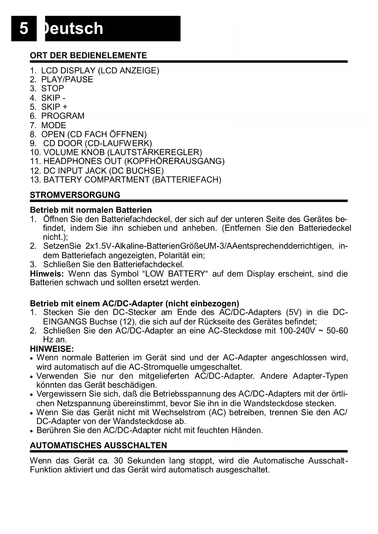 - Intro: Alle Titel werden 10 sekunden lang abgespielt.7 Deutsch WARTUNG Reinigen des Gerätes Wischen Sie das Gerätegehäuse mit einem weichen Tuch ab, das mit einer milden Seifenwasserlösung angefeuchtet ist. Umgang mit den CDs Ihr CD-Spieler wurde speziell entwickelt, um Compact Discs mit der Marke CD wieder- zugeben. Es sollten keine anderen Discs ins Gerät eingelegt werden. Legen Sie die Disc immer mit der beschrifteten Seite nach oben ein. Auch wenn die Compact Discs während der Wiedergabe keiner Abnutzung unterliegen, könnten durch unsachgemäßen Umgang hervorgerufene Schäden zu einer unre- gelmäßigen Wiedergabequalität führen. Um den guten Zustand Ihrer Compact Discs zu bewahren, gehen Sie bitte sorgfältig mit ihnen um. Obwohl kleinste Staubteilchen und Fingerabdrücke keinen Einfluß auf die Wiedergabe haben, sollten Sie die bespielte Oberfläche Ihrer Discs sauber halten. Wi- schen Sie die Disc mit einem sauberen, trockenen, fusselfreien und weichen Tuch ab, wobei Sie mit geraden Bewegungen von der Mitte nach außen vorgehen. Verwenden Sie niemals Plattenreiniger, Plattensprays, Antistatik-Sprays, Flüssigkei- ten oder chemische Flüssigkeiten, um die Oberfläche der Disc zu reinigen. Der Pla- stiküberzug könnte ernsthaft beschädigt werden. WICHTIG Die Bewegung des CD-Mechanismus und der empfindliche Stromkreis können Störungen bei einem nahestehenden Radio oder Tuner hervorrufen. Schalten Sie die- ses Gerät aus, wenn Sie andere Radios verwenden. Dieses Gerät verwendet einen Laser: Gefahr - Unsichtbare Laserstrahlung beim Öffnen und wenn das Schließsystem ver- sagt oder beschädigt ist. Vermeiden Sie es, sich der direkten Strahlung auszusetzen. Vorsicht - Die Benutzung von Bedienelementen, das Vornehmen von Regulierungen oder Einstellungen, die nicht in dieser Bedienungsanleitung aufgeführt sind, könnten Sie einer gefährlichen Strahlung aussetzen.8 Deutsch TECHNISCHE DATEN Stromversorgung: DC 5V (Adapter). DC 3V = (2 x “LR6” Batt. nicht inklusiv). Allgemeine Kopfhörer: 3.5mm jack buchse. Ausführung und Spezifikationen unterliegen unangekündigten Änderungen. Die Kennzeichnung auf dem Produkt bzw. auf der dazugehörigen Literatur gibt an, dass es nach seiner Lebensdauer nicht zusammen mit dem normalen HaushaltsmüIl entsorgt werden darf. Entsorgen Sie die-ses Gerat bitte getrennt von anderen Abfallen, um der Umwelt bzw. der menschl i chen Gesundhei t ni cht durch unkontrol l i erte Mül l besei ti gung zu schaden. Recycel n Si e das Gerät, um di e nachhaltige Wie-derverwertung von stofflichen Ressourcen zu fördern. Private Nutzer sollten den Händler, bei dem das Produkt gekauft wurde, oder die zuständigen Behörden kontaktieren, um in Erfahrung zu bringen, wie sie das Gerät auf umweltfreundliche Weise recyceln können. Gewerbliche Nutzer sollten sich an Ihren Liefe-ranten wenden und die Bedingungen des Verkaufsvertrags konsultieren. Dieses Produkt darf nicht zusam-men mit anderem Gewerbemüll entsorgt werden.