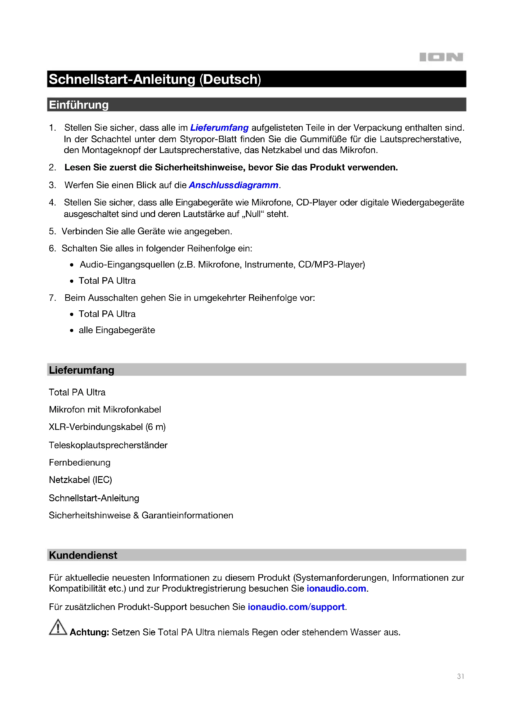 Kundendienst Für aktuelledie neuesten Informationen zu diesem Produkt (Systemanforderungen, Informationen zur Kompatibilität etc.) und zur Produktregistrierung besuchen Sie ionaudio.com. Für zusätzlichen Produkt-Support besuchen Sie ionaudio.com/support. Achtung: Setzen Sie Total PA Ultra niemals Regen oder stehendem Wasser aus.32 Schnelles Einrichten Anschlussdiagramm