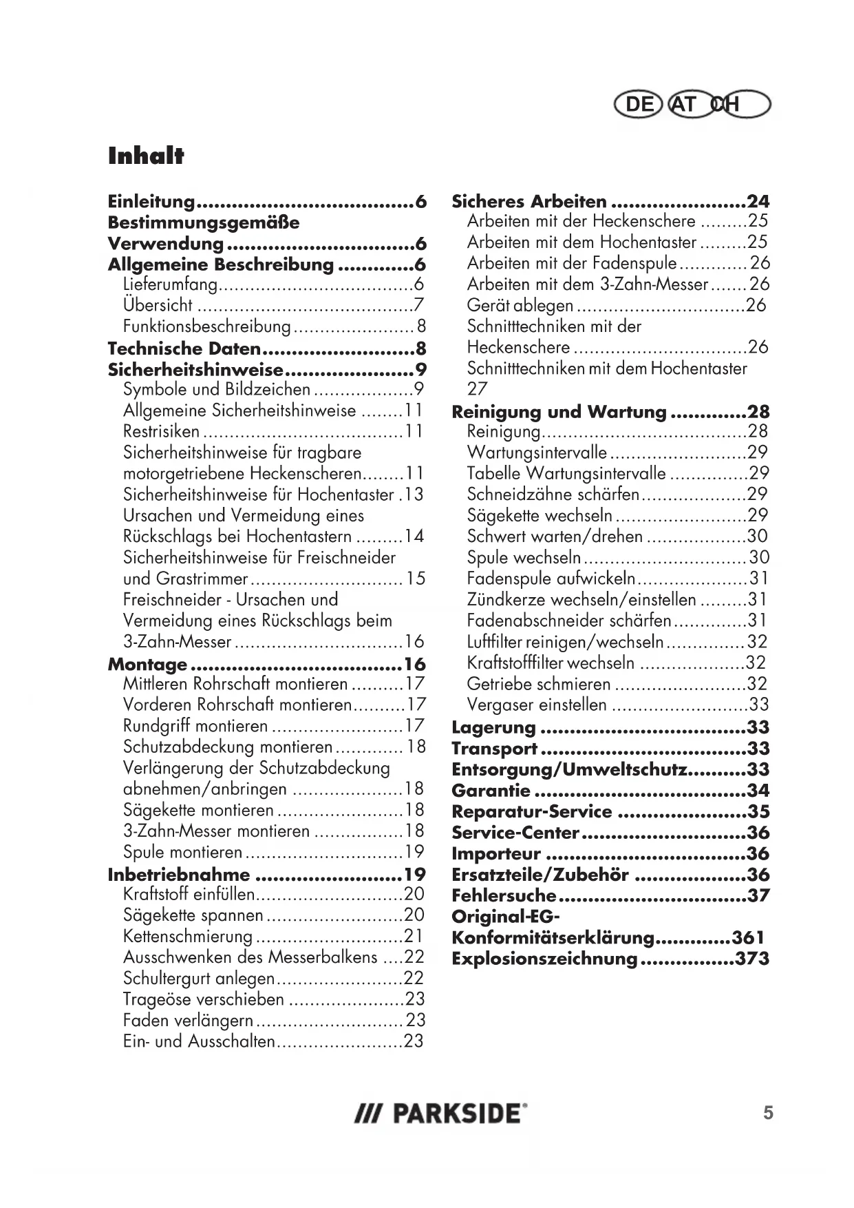 Einleitung Herzlichen Glückwunsch zum Kauf Ihres neuen Gerätes. Sie haben sich damit für ein hochwertiges Produkt entschieden. Dieses Gerät wurde während der Produkti- on auf Qualität geprüft und einer Endkon- trolle unterzogen. Die Funktionsfähigkeit Ihres Gerätes ist somit sichergestellt. Es ist nicht auszuschließen, dass sich in Ein- zelfällen am oder im Gerät Restmengen von Schmierstoffen benden. Dies ist kein Mangel oder Defekt und kein Grund zur Besorgnis. Die Betriebsanleitung ist Bestandteil dieses Produkts. Sie enthält wichtige Hinweise für Sicherheit, Gebrauch und Ent- sorgung. Machen Sie sich vor der Benut- zung des Produkts mit allen Bedien- und Si- cherheitshinweisen vertraut. Benutzen Sie das Produkt nur wie beschrieben und für die angegebenen Einsatzbereiche. Bewah- ren Sie die Betriebsanleitung gut auf und händigen Sie alle Unterlagen bei Weiter- gabe des Produkts an Dritte mit aus. Bestimmungsgemäße Verwendung Das Gerät ist mit Heckenscheren-Aufsatz für das Schneiden und Trimmen von Hecken, Büschen und Ziersträuchern ge- eignet. Der Hochentaster-Aufsatz ist für das Schneiden größerer Zweige und Äste bestimmt. Der Aufsatz für Trimmer und 3-Zahn-Messer ist für Mäharbeiten von Gras in Gärten, entlang von Beeträndern und um Bäume oder Zaunpfähle und leichtem Gestrüpp geeignet. Das Gerät ist für den Gebrauch im häuslichen Bereich bestimmt. Das Gerät ist nicht für den gewerblichen Einsatz bestimmt. Bei gewerblichem Ein- satz erlischt die Garantie. Jede andere Verwendung, die in dieser Betriebsanlei- tung nicht ausdrücklich zugelassen wird, kann zu Schäden am Gerät führen und eine ernsthafte Gefahr für den Benutzer darstellen. Das Gerät ist zum Gebrauch durch Er- wachsene bestimmt. Jugendliche über 16 Jahre dürfen das Gerät nur unter Aufsicht benutzen. Lokale Vorschriften können die Altersbeschränkung für den Anwender fest- legen. Die Benutzung des Gerätes bei Re- gen oder feuchter Umgebung ist verboten. Der Bediener oder Nutzer ist für Unfälle oder Schäden an anderen Menschen oder deren Eigentum verantwortlich. Der Hersteller haftet nicht für Schäden, die durch bestimmungswidrigen Gebrauch oder falsche Bedienung verursacht wurden. Allgemeine Beschreibung Die Abbildung der wichtigsten Funktionsteile nden Sie auf der vorderen und hinteren Ausklappseite. Lieferumfang - Motoreinheit - Heckenscheren-Aufsatz - Hochentaster-Aufsatz - Freischneider-/Grasstrimmervorsatz - Verlängerungsvorsatz, Länge: 905mm - Sägekette - Schwert - Spulenkapsel - Rundgriff - 3-Zahn-Messer - Schutzabdeckung - 100ml Bio-Sägekettenöl - 1 x Mischbehälter - Trichter - 1 x SchultergurtDE AT CH