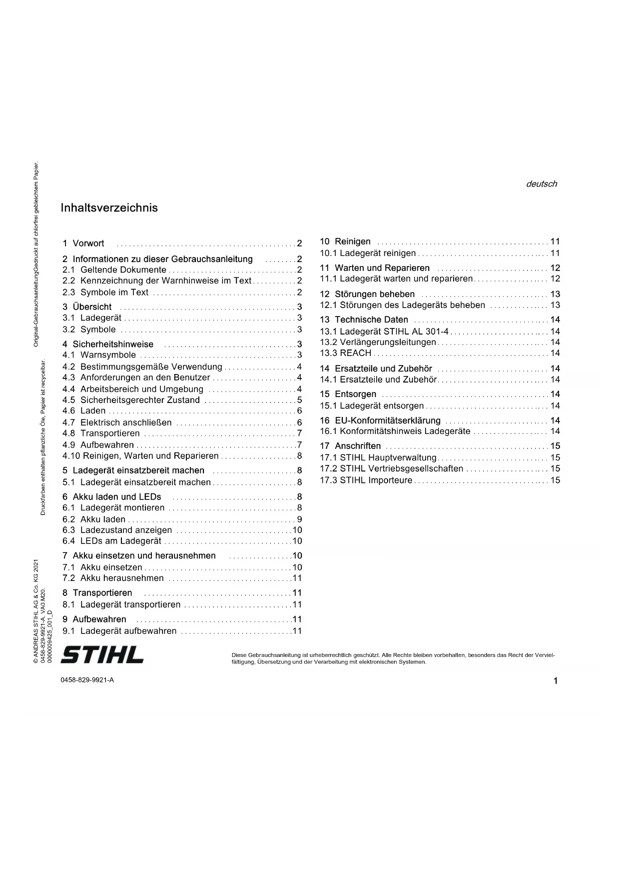 Dieses Ladegerät ist in Übereinstimmung mit folgenden Richtlinien gefertigt und in Verkehr gebracht worden: 2014/35/EU, 2014/30/EU und 2011/65/EU. Das Baujahr, das Herstellungsland und die Maschinennummer sind auf dem Ladegerät angegeben. 13 Technische Daten 14 Ersatzteile und Zubehör Diese Symbole kennzeichnen original STIHL Ersatzteile und original STIHL Zubehör. 15 Entsorgen 16 EU-Konformitätserklärung0458-829-9921-A