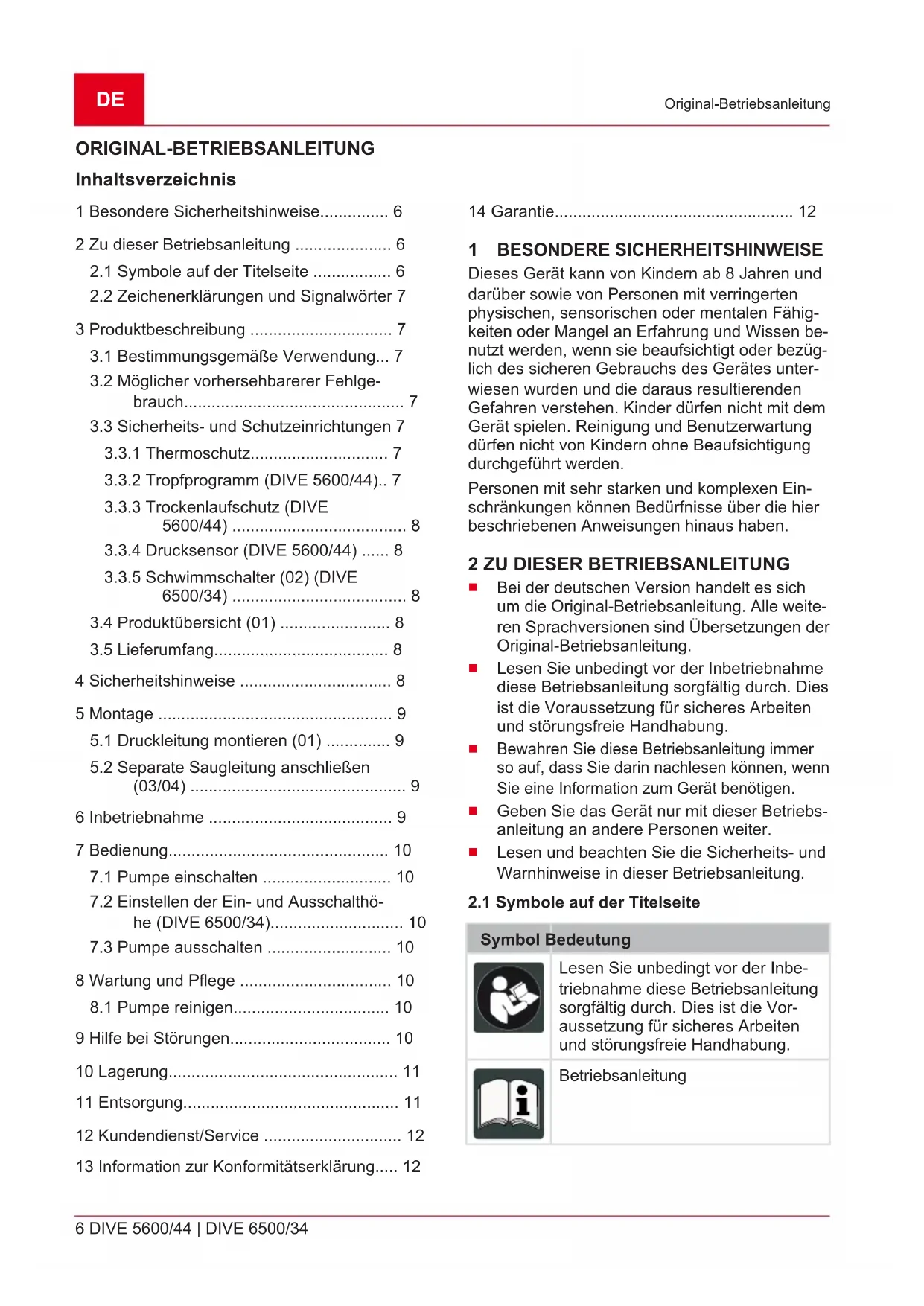 - 1 1/2“ 1 1/2‘‘ 0,5 mm 0,5 mm ≈ 400 mm ≈ 200 mm On: ≈ 2 bar Off: ≈ 4,4 bar ≈ 35 °C ≈ 35 °C 10 kg 11 kg 10 m 10 mDE 6 DIVE 5600/44 | DIVE 6500/34 Original-Betriebsanleitung ORIGINAL-BETRIEBSANLEITUNG Inhaltsverzeichnis 1 Besondere Sicherheitshinweise p. 6