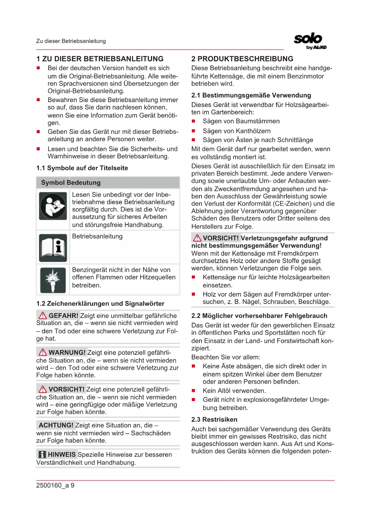 GEFAHR! Zeigt eine unmittelbar gefährliche Situation an, die – wenn sie nicht vermieden wird – den Tod oder eine schwere Verletzung zur Fol- ge hat. WARNUNG! Zeigt eine potenziell gefährli- che Situation an, die – wenn sie nicht vermieden wird – den Tod oder eine schwere Verletzung zur Folge haben könnte. VORSICHT! Zeigt eine potenziell gefährli- che Situation an, die – wenn sie nicht vermieden wird – eine geringfügige oder mäßige Verletzung zur Folge haben könnte. ACHTUNG! Zeigt eine Situation an, die – wenn sie nicht vermieden wird – Sachschäden zur Folge haben könnte. HINWEIS Spezielle Hinweise zur besseren Verständlichkeit und Handhabung. 2 PRODUKTBESCHREIBUNG Diese Betriebsanleitung beschreibt eine handge- führte Kettensäge, die mit einem Benzinmotor betrieben wird.