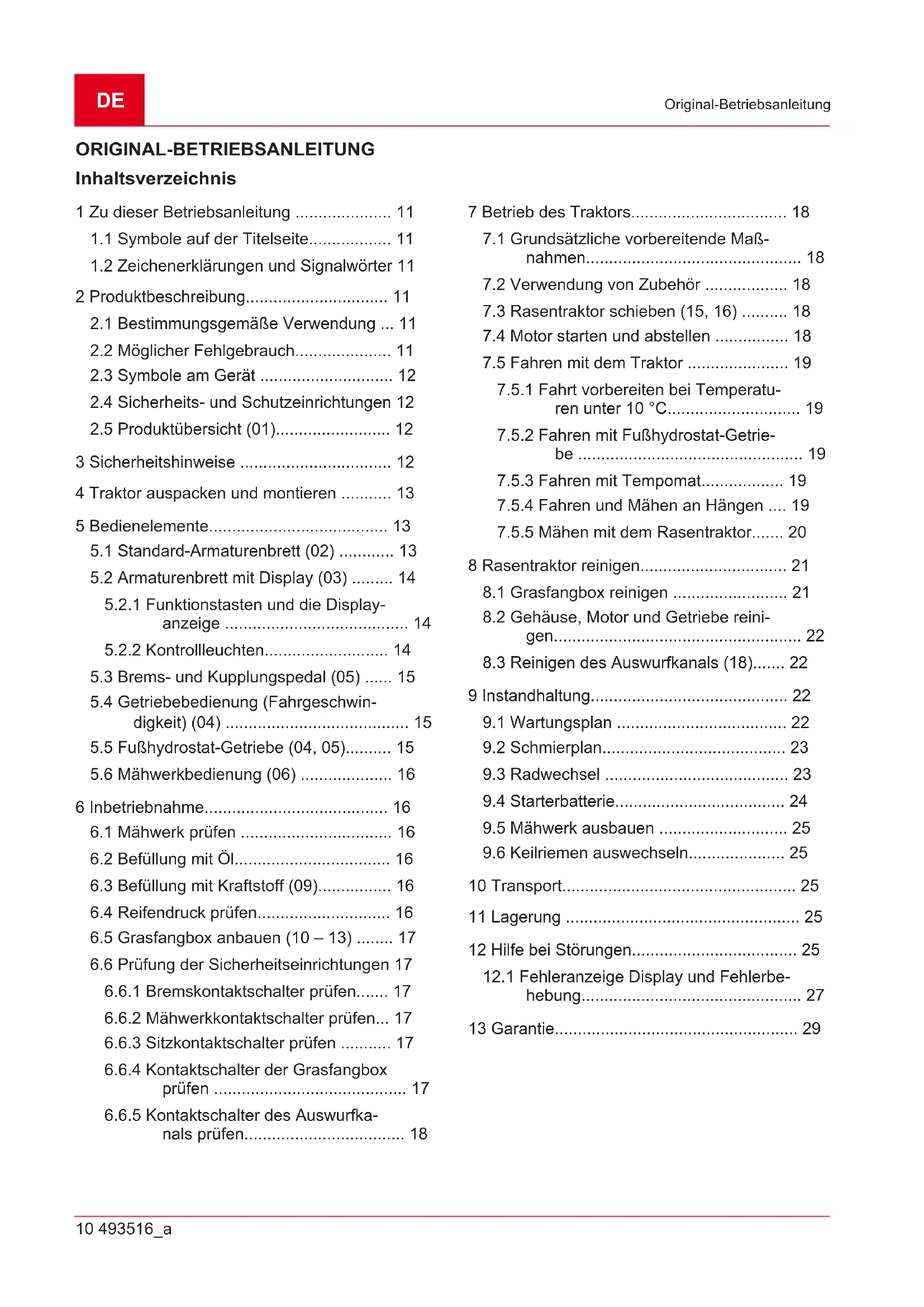 42493516_a 9DE 10 493516_a Original-Betriebsanleitung ORIGINAL-BETRIEBSANLEITUNG Inhaltsverzeichnis 1 Zu dieser Betriebsanleitung ..................... 11