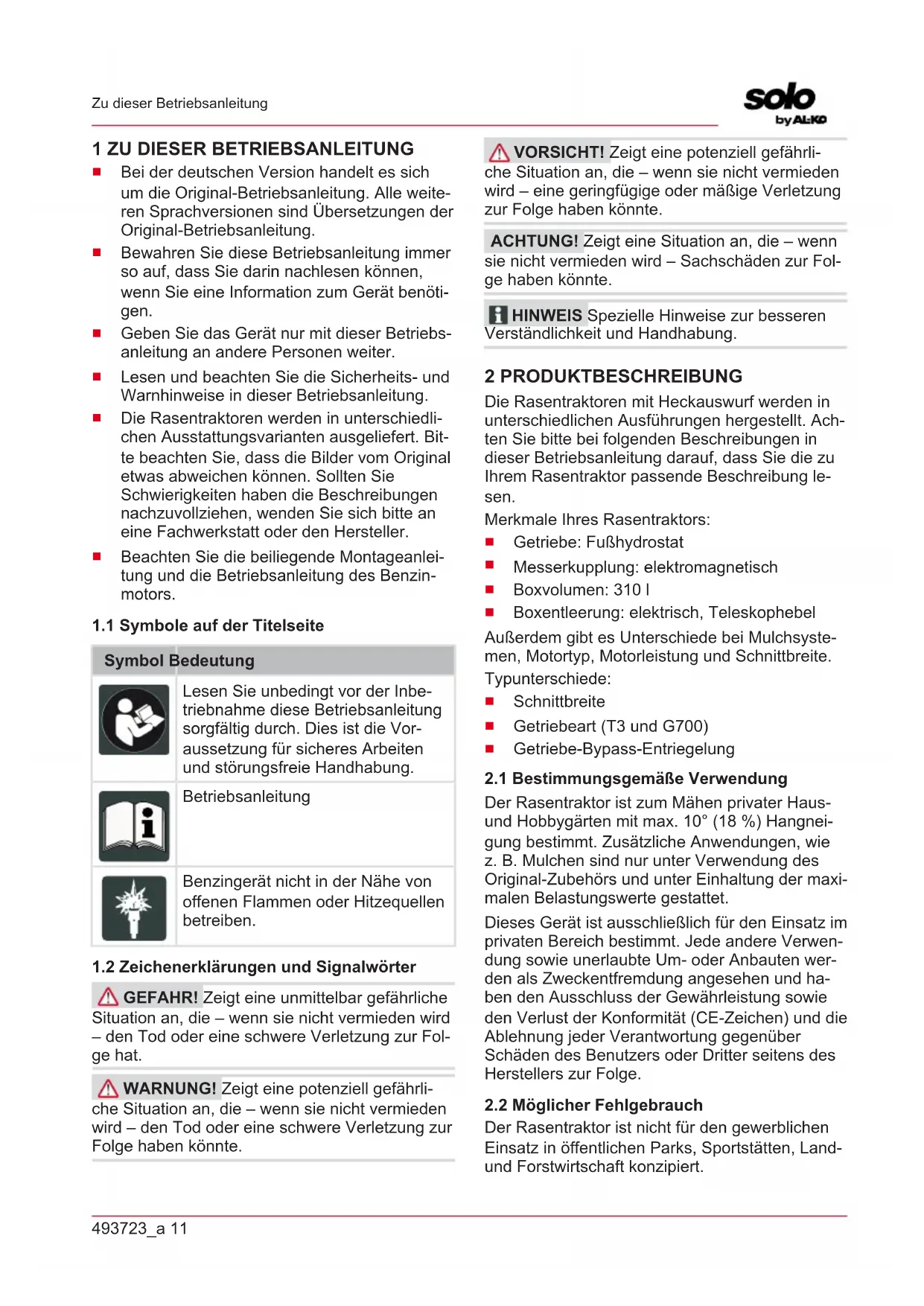 GEFAHR! Zeigt eine unmittelbar gefährliche Situation an, die – wenn sie nicht vermieden wird – den Tod oder eine schwere Verletzung zur Fol- ge hat. WARNUNG! Zeigt eine potenziell gefährli- che Situation an, die – wenn sie nicht vermieden wird – den Tod oder eine schwere Verletzung zur Folge haben könnte. VORSICHT! Zeigt eine potenziell gefährli- che Situation an, die – wenn sie nicht vermieden wird – eine geringfügige oder mäßige Verletzung zur Folge haben könnte. ACHTUNG! Zeigt eine Situation an, die – wenn sie nicht vermieden wird – Sachschäden zur Fol- ge haben könnte. HINWEIS Spezielle Hinweise zur besseren Verständlichkeit und Handhabung. 2 PRODUKTBESCHREIBUNG Die Rasentraktoren mit Heckauswurf werden in unterschiedlichen Ausführungen hergestellt. Ach- ten Sie bitte bei folgenden Beschreibungen in dieser Betriebsanleitung darauf, dass Sie die zu Ihrem Rasentraktor passende Beschreibung le- sen. Merkmale Ihres Rasentraktors: