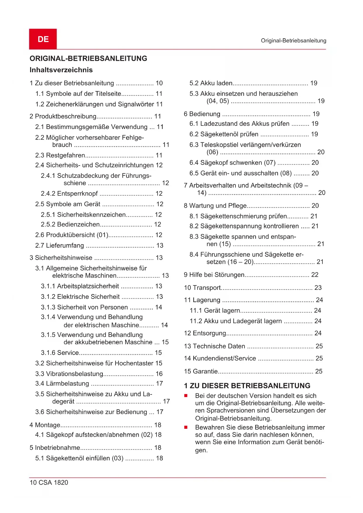 Verschleißteile, die auf der Ersatzteilkarte mit Rahmen xxxxxx (x) gekennzeichnet sind Die Garantiezeit beginnt mit dem Kauf durch den ersten Endabnehmer. Maßgebend ist das Datum auf dem Kaufbeleg. Wenden Sie sich bitte mit dieser Erklärung und dem Original-Kaufbeleg an Ihren Händler oder die nächste autorisierte Kundendienststelle. Die gesetzlichen Mängelansprüche des Käufers gegenüber dem Verkäufer bleiben durch diese Erklärung unberührt.GB 26 CSA 1820 Translation of the original instructions for use TRANSLATION OF THE ORIGINAL INSTRUCTIONS FOR USE Contents 1 About these operating instructions .......... 26