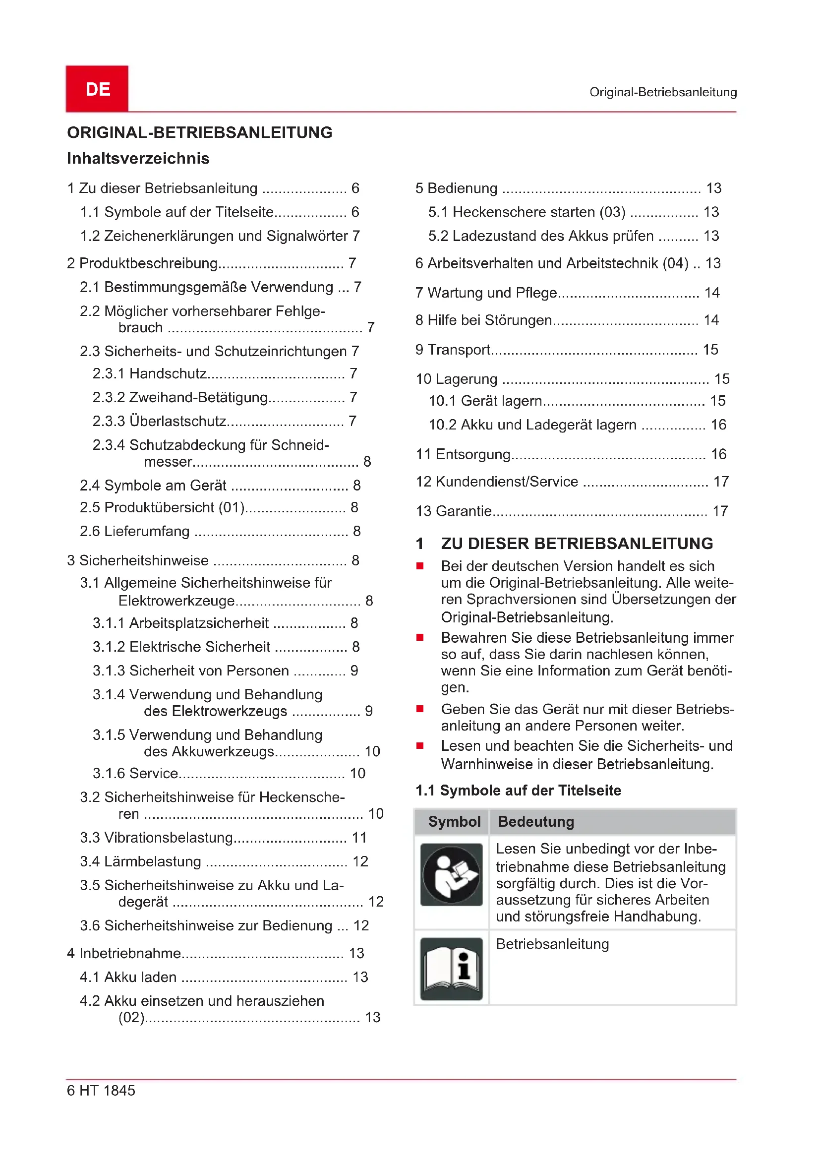 Verschleißteile, die auf der Ersatzteilkarte mit Rahmen xxxxxx (x) gekennzeichnet sind Die Garantiezeit beginnt mit dem Kauf durch den ersten Endabnehmer. Maßgebend ist das Datum auf dem Kaufbeleg. Wenden Sie sich bitte mit dieser Erklärung und dem Original-Kaufbeleg an Ihren Händler oder die nächste autorisierte Kundendienststelle. Die gesetzlichen Mängelansprüche des Käufers gegenüber dem Verkäufer bleiben durch diese Erklärung unberührt.GB 18 HT 1845 Translation of the original instructions for use TRANSLATION OF THE ORIGINAL INSTRUCTIONS FOR USE Contents 1 About these operating instructions .......... 18