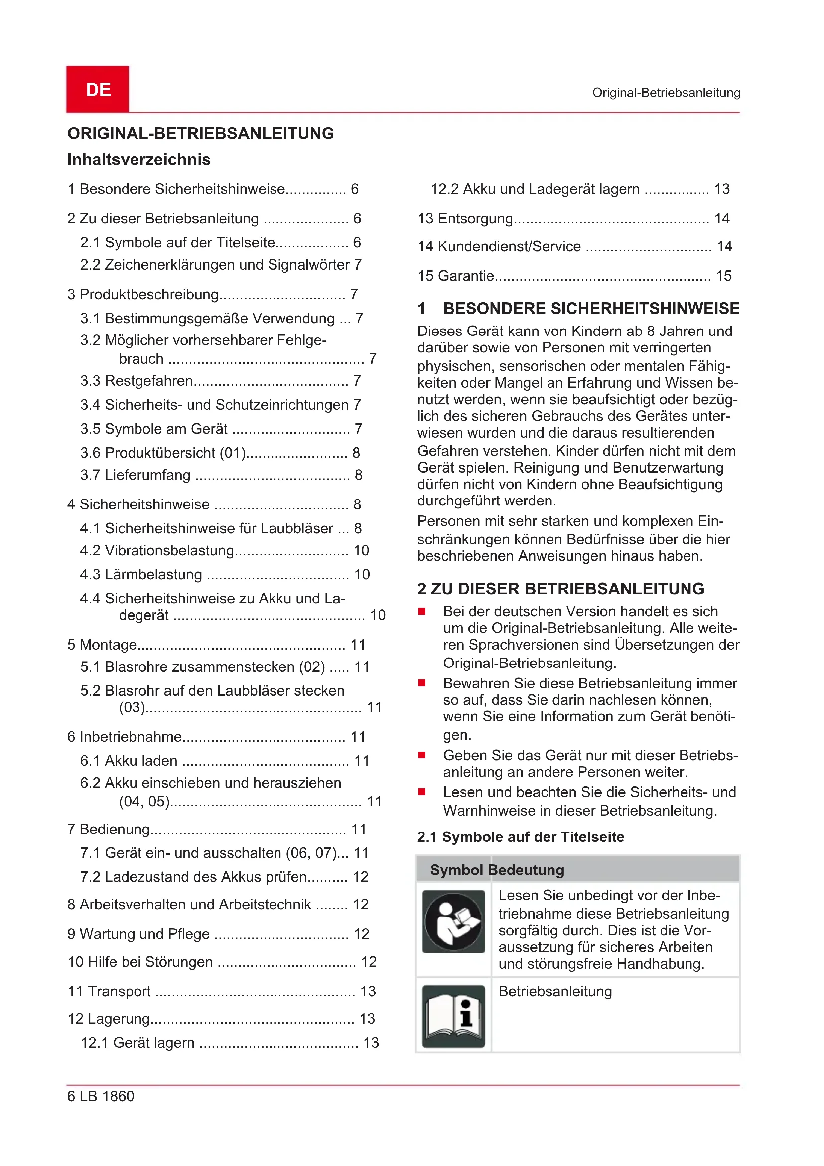 Symbol Bedeutung Besondere Vorsicht bei der Hand- habung! Vor der Inbetriebnahme die Be- triebsanleitung lesen!DE 8 LB 1860 Sicherheitshinweise Symbol Bedeutung Augen- und Gehörschutz tragen! Gefahr durch herausschleudernde Gegenstände! Dritte aus dem Gefahrenbereich fernhalten! Vor Wartungsarbeiten Betriebsan- leitung lesen. Gerät vor Regen und Nässe schüt- zen! Nicht in den Lüfter fassen. Gefahr durch rotierende Bauteile