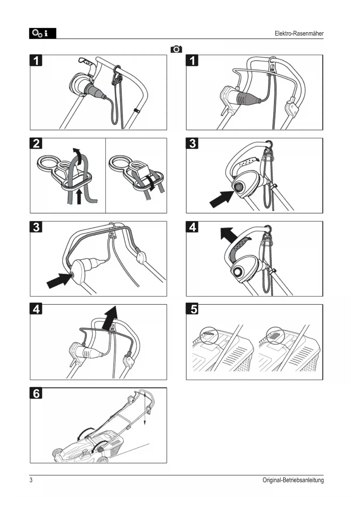 Montage Beiliegende Montageanleitung beachten.Achtung!Das Gerät darf erst nach vollständiger Montagebetrieben werden!Grasfangkorb anbringenAchtung - Verletzungsgefahr!Grasfangkorb nur bei ausgeschaltetem Motor und stillstehendem Schneidmesser abnehmen oder anbringen.1. Prallklappe anheben und Grasfangkorb in die Halter einhängen.Grasfangkorb leerenWenn die Gras-Füllstandanzeige am Grasfangkorb auf demKorbauiegt,mussderKorbgeleertwerden1. Prallklappe anheben.2. Grasfangkorb aushängen und nach hinten abnehmen.3. Grasfangkorb leeren.4. Prallklappe anheben und Grasfangkorb wieder in die Halter einhängen.Netzanschluss herstellen1. Netzstecker der Geräteanschlussleitung in die Schalter-Stecker-Kombination einstecken .2. Geräteanschlussleitung mit Kabelzugentlastung sichern . Die Schlaufe des Netzkabels muss so lang sein, dass die Kabelzugentlastung von einer Seite zur anderen gleiten kann.Motor einschaltenDen Rasenmäher nur auf ebenem Untergrund, nicht in hohem Gras starten. Der Untergrund muss frei von Fremdkörpern wie z. B. Steinen sein. Den Rasenmäher zum Starten nicht anheben.1. Startknopf der Schalter-Stecker-Kombination gedrückt halten .2. Sicherheitsbügel / -griff gegen den Holm ziehen und festhalten .3. Startknopf loslassen.Motor ausschalten1. Sicherheitsbügel / -griff loslassen.2. Stillstand des Schneidmessers abwarten. Arbeitshinweise Örtliche Bestimmungen zum Betreiben von Rasenmähern beachten. Das zu mähende Terrain vollständig und sorgfältig prüfen - alle Fremdkörper entfernen Nur mähen, wenn sich kein Dritter im Arbeitsbe-reichbendet Nur bei guten Sichtverhältnissen mähen Gerät nur im Schritttempo führen Nur mit scharfem Schneidmesser mähen Nicht über Hindernisse mähen (z. B. Zweige, Baumwurzeln) Bei Hanglagen stets quer zum Hang mähen. Rasenmäher nicht hangauf- oder hangabwärts und an Hängen mit mehr als 20 ° Neigung benutzen Erhöhte Vorsicht an Hanglagen bei Änderung der ArbeitsrichtungTipps zum Mähen Optimale Holmhöhe an den beiden Rastschrauben einstellen Mit dem Mähen möglichst nahe an der Steckdose beginnen Verlängerungskabel immer auf der bereits gemäh-tenRasenächeführen Schnitthöhe gleichbleibend 3–5 cm, nicht mehr als die Hälfte der Rasenhöhe abmähen Rasenmäher nicht überlasten! Sinkt die Motor-drehzahl durch langes, schweres Gras merklich, Schnitthöhe vergrößern und mehrfach mähen In den Morgenstunden oder am späten Nachmit-tag mähen, um den frisch geschnittenen Rasen vor Austrocknen zu schützen Während starker Wachstumsphasen zweimal in der Woche mähen, in regenarmen Zeiten entsprechend seltener