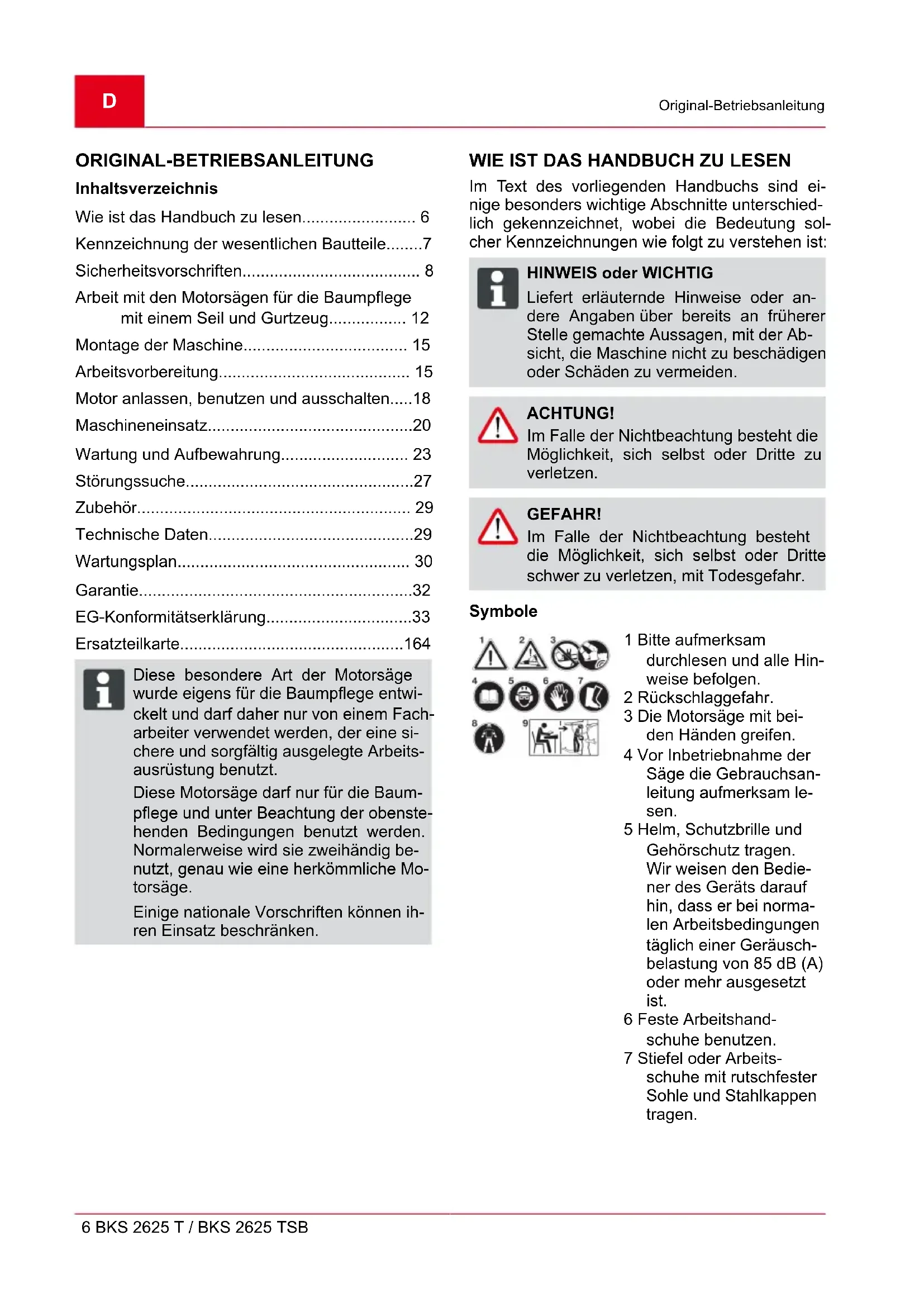 Im Text des vorliegenden Handbuchs sind ei- nige besonders wichtige Abschnitte unterschied- lich gekennzeichnet, wobei die Bedeutung sol- cher Kennzeichnungen wie folgt zu verstehen ist: HINWEIS HINWEIS oder WICHTIG Liefert erläuternde Hinweise oder an- dere Angaben über bereits an früherer Stelle gemachte Aussagen, mit der Ab- sicht, die Maschine nicht zu beschädigen oder Schäden zu vermeiden. ACHTUNG! Im Falle der Nichtbeachtung besteht die Möglichkeit, sich selbst oder Dritte zu verletzen. GEFAHR! Im Falle der Nichtbeachtung besteht die Möglichkeit, sich selbst oder Dritte schwer zu verletzen, mit Todesgefahr. Symbole 1 Bitte aufmerksam durchlesen und alle Hin- weise befolgen. 2 Rückschlaggefahr. 3 Die Motorsäge mit bei- den Händen greifen. 4 Vor Inbetriebnahme der Säge die Gebrauchsan- leitung aufmerksam le- sen. 5 Helm, Schutzbrille und Gehörschutz tragen. Wir weisen den Bedie- ner des Geräts darauf hin, dass er bei norma- len Arbeitsbedingungen täglich einer Geräusch- belastung von 85 dB (A) oder mehr ausgesetzt ist. 6 Feste Arbeitshand- schuhe benutzen. 7 Stiefel oder Arbeits- schuhe mit rutschfester Sohle und Stahlkappen tragen.Wie ist das Handbuch zu lesen 469850_d 7 8 Geeignete Schutzvor- richtungen für Füße- Beine und Hände-Arme verwenden. 9 Diese Motorsäge ist nur für Bediener geeignet, die für die Baumpflege ausgebildet sind. (siehe Gebrauchsanweisung). Beschreibende Symbole an der Maschine (falls vorhanden) 11 Gemischtank 12 Kettenöltank 13 Motorabstellschalter Mit dem Schalter in Position «I» startet der Motor Wenn man den Schalter auf «O» stellt, hält der Motor so- fort an. 14 Vergasereinstellung L = Gemischregelung niedrige Drehzahl H = Gemischregelung hohe Drehzahl