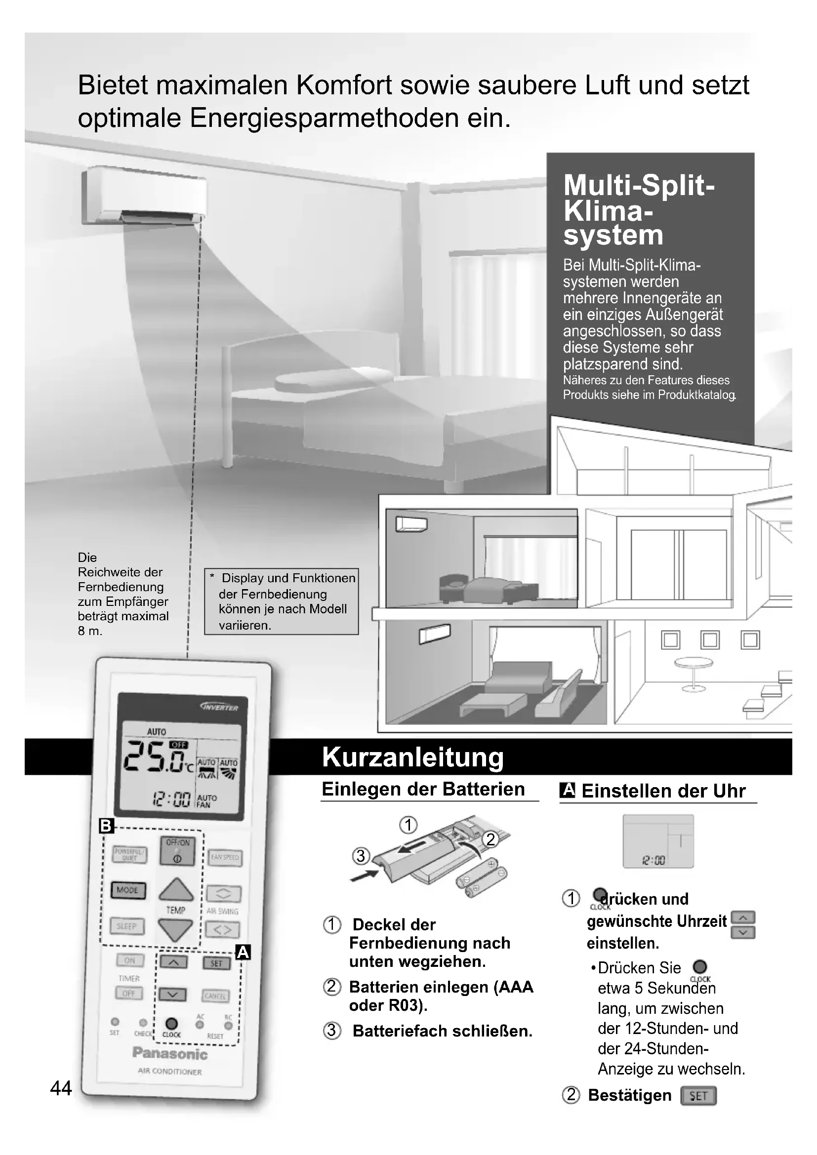 Bietet maximalen Komfort sowie saubere Luft und setzt optimale Energiesparmethoden ein. Die Reichweite der Fernbedienung zum Empfänger beträgt maximal 8 m. Kurzanleitung Einlegen der Batterien