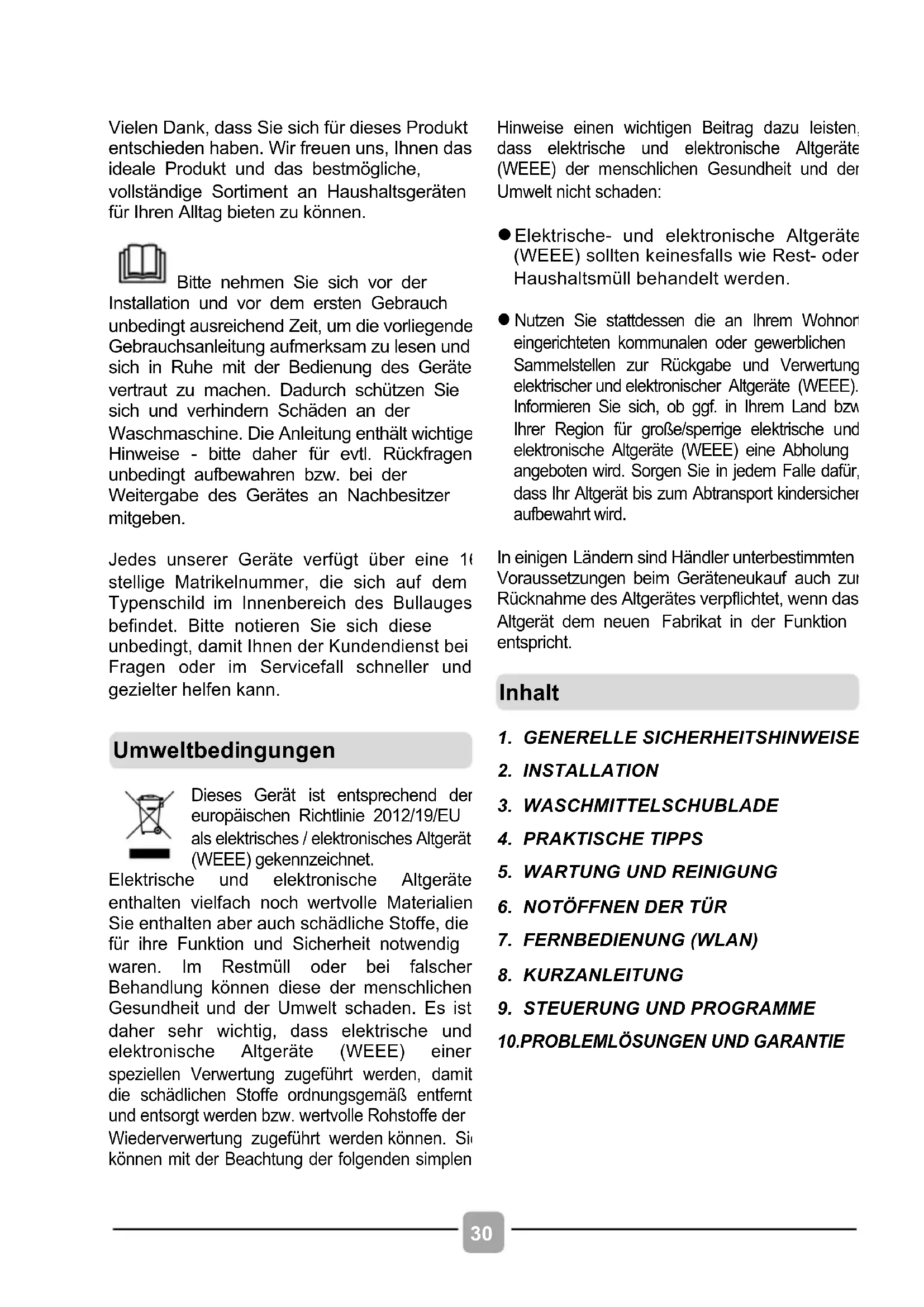Vielen Dank, dass Sie sich für dieses Produkt entschieden haben. Wir freuen uns, Ihnen das ideale Produkt und das bestmögliche, vollständige Sortiment an Haushaltsgeräten für Ihren Alltag bieten zu können. Bitte nehmen Sie sich vor der Installation und vor dem ersten Gebrauch unbedingt ausreichend Zeit, um die vorliegende Gebrauchsanleitung aufmerksam zu lesen und sich in Ruhe mit der Bedienung des Gerätes vertraut zu machen. Dadurch schützen Sie sich und verhindern Schäden an der Waschmaschine. Die Anleitung enthält wichtige Hinweise - bitte daher für evtl. Rückfragen unbedingt aufbewahren bzw. bei der Weitergabe des Gerätes an Nachbesitzer mitgeben. Jedes unserer Geräte verfügt über eine 16- stellige Matrikelnummer, die sich auf dem Typenschild im Innenbereich des Bullauges befindet. Bitte notieren Sie sich diese unbedingt, damit Ihnen der Kundendienst bei Fragen oder im Servicefall schneller und gezielter helfen kann.