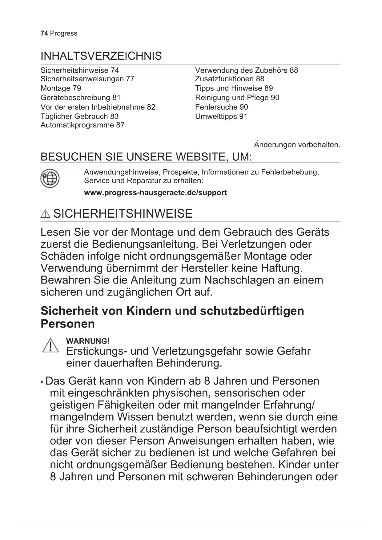- Das Gerät kann von Kindern ab 8 Jahren und Personen mit eingeschränkten physischen, sensorischen oder geistigen Fähigkeiten oder mit mangelnder Erfahrung/ mangelndem Wissen benutzt werden, wenn sie durch eine für ihre Sicherheit zuständige Person beaufsichtigt werden oder von dieser Person Anweisungen erhalten haben, wie das Gerät sicher zu bedienen ist und welche Gefahren bei nicht ordnungsgemäßer Bedienung bestehen. Kinder unter 8 Jahren und Personen mit schweren Behinderungen oder 74 ProgressMehrfachbehinderung sollten vom Gerät ferngehalten werden, wenn sie nicht ständig beaufsichtigt werden.
