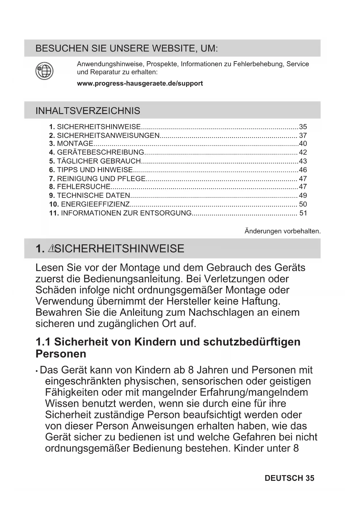 Ihre Pflichten als Endnutzer Dieses Elektro- bzw. Elektronikgerät ist mit einer durchgestrichenen Abfalltonne auf Rädern gekennzeichnet. Das Gerät darf deshalb nur getrennt vom unsortierten Siedlungsabfall gesammelt und zurückgenommen werden, es darf also nicht in den Hausmüll gegeben werden. Das Gerät kann z. B. bei einer kommunalen Sammelstelle oder ggf. bei einem Vertreiber (siehe zu deren Rücknahmepflichten in Deutschland unten) abgegeben werden. Das gilt auch für alle Bauteile, Unterbaugruppen und Verbrauchsmaterialien des zu entsorgenden Altgeräts. Bevor das Altgerät entsorgt werden darf, müssen alle Altbatterien und Altakkumulatoren vom Altgerät getrennt werden, die nicht vom Altgerät umschlossen sind. Das gleiche gilt für Lampen, die zerstörungsfrei aus dem Altgerät entnommen werden können. Der Endnutzer ist zudem selbst dafür verantwortlich, personenbezogene Daten auf dem Altgerät zu löschen. Hinweise zum Recycling Helfen Sie mit, alle Materialien zu recyceln, die mit diesem Symbol gekennzeichnet sind. Entsorgen Sie solche Materialien, insbesondere Verpackungen, nicht im Hausmüll sondern über die bereitgestellten Recyclingbehälter oder die entsprechenden örtlichen Sammelsysteme. Recyceln Sie zum Umwelt- und Gesundheitsschutz auch elektrische und elektronische Geräte. DEUTSCH 51Rücknahmepflichten der Vertreiber (Folgende Hinweise gelten ergänzend in Deutschland) Wer auf mindestens 400 m² Verkaufsfläche Elektro- und Elektronikgeräte vertreibt oder sonst geschäftlich an Endnutzer abgibt, ist verpflichtet, bei Abgabe eines neuen Geräts ein Altgerät des Endnutzers der gleichen Geräteart, das im Wesentlichen die gleichen Funktionen wie das neue Gerät erfüllt, am Ort der Abgabe oder in unmittelbarer Nähe hierzu unentgeltlich zurückzunehmen. Das gilt auch für Vertreiber von Lebensmitteln mit einer Gesamtverkaufsfläche von mindestens 800 m², die mehrmals im Kalenderjahr oder dauerhaft Elektro- und Elektronikgeräte anbieten und auf dem Markt bereitstellen. Solche Vertreiber müssen zudem auf Verlangen des Endnutzers Altgeräte, die in keiner äußeren Abmessung größer als 25 cm sind (kleine Elektrogeräte), im Einzelhandelsgeschäft oder in unmittelbarer Nähe hierzu unentgeltlich zurückzunehmen; die Rücknahme darf in diesem Fall nicht an den Kauf eines Elektro- oder Elektronikgerätes geknüpft, kann aber auf drei Altgeräte pro Geräteart beschränkt werden. Ort der Abgabe ist auch der private Haushalt, wenn das neue Elektro- oder Elektronikgerät dorthin geliefert wird; in diesem Fall ist die Abholung des Altgerätes für den Endnutzer kostenlos. Die vorstehenden Pflichten gelten auch für den Vertrieb unter Verwendung von Fernkommunikationsmitteln, wenn die Vertreiber Lager- und Versandflächen für Elektro- und Elektronikgeräte bzw. Gesamtlager- und -versandflächen für Lebensmittel vorhalten, die den oben genannten Verkaufsflächen entsprechen. Die unentgeltliche Abholung von Elektro- und Elektronikgeräten ist dann aber auf Wärmeüberträger (z. B. Kühlschrank), Bildschirme, Monitore und Geräte, die Bildschirme mit einer Oberfläche von mehr als 100 cm² enthalten, und Geräte beschränkt, bei denen mindestens eine der äußeren Abmessungen mehr als 50 cm beträgt. Für alle übrigen Elektro- und Elektronikgeräte muss der Vertreiber geeignete Rückgabemöglichkeiten in zumutbarer Entfernung zum jeweiligen Endnutzer gewährleisten; das gilt auch für kleine Elektrogeräte (s.o.), die der Endnutzer zurückgeben will, ohne ein neues Gerät zu kaufen. 52 DEUTSCH *535455www.progress-hausgeraete.de 867373464-A-062022