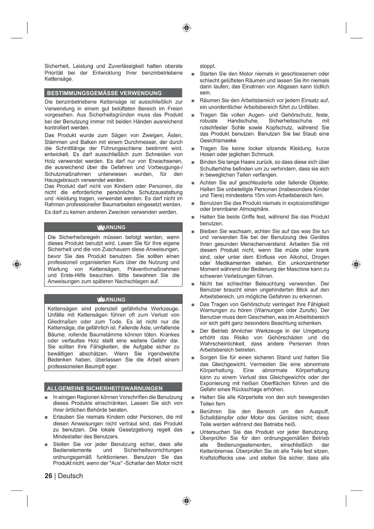 Die benzinbetriebene Kettensäge ist ausschließlich zur Verwendung in einem gut belüfteten Bereich im Freien vorgesehen. Aus Sicherheitsgründen muss das Produkt bei der Benutzung immer mit beiden Händen ausreichend kontrolliert werden. Das Produkt wurde zum Sägen von Zweigen, Ästen, Stämmen und Balken mit einem Durchmesser, der durch die Schnittlänge der Führungsschiene bestimmt wird, entwickelt. Es darf ausschließlich zum Schneiden von Holz verwendet werden. Es darf nur von Erwachsenen, die ausreichend über die Gefahren und Vorbeugungs-/ Schutzmaßnahmen unterwiesen wurden, für den Hausgebrauch verwendet werden. Das Produkt darf nicht von Kindern oder Personen, die nicht die erforderliche persönliche Schutzausstattung und -kleidung tragen, verwendet werden. Es darf nicht im Rahmen professioneller Baumarbeiten eingesetzt werden. Es darf zu keinen anderen Zwecken verwenden werden. WARNUNG Die Sicherheitsregeln müssen befolgt werden, wenn dieses Produkt benutzt wird. Lesen Sie für Ihre eigene Sicherheit und die von Zuschauern diese Anweisungen, bevor Sie das Produkt benutzen. Sie sollten einen professionell organisierten Kurs über die Nutzung und Wartung von Kettensägen, Präventivmaßnahmen und Erste-Hilfe besuchen. Bitte bewahren Sie die Anweisungen zum späteren Nachschlagen auf. WARNUNG Kettensägen sind potenziell gefährliche Werkzeuge. Unfälle mit Kettensägen führen oft zum Verlust von Gliedmaßen oder zum Tode. Es ist nicht nur die Kettensäge, die gefährlich ist. Fallende Äste, umfallende Bäume, rollende Baumstämme können töten. Krankes oder verfaultes Holz stellt eine weitere Gefahr dar. Sie sollten Ihre Fähigkeiten, die Aufgabe sicher zu bewältigen abschätzen. Wenn Sie irgendwelche Bedenken haben, überlassen Sie die Arbeit einem professionellen Baumpfl eger. ALLGEMEINE SICHERHEITSWARNUNGEN ■ In einigen Regionen können Vorschriften die Benutzung dieses Produkts einschränken. Lassen Sie sich von Ihrer örtlichen Behörde beraten. ■ Erlauben Sie niemals Kindern oder Personen, die mit diesen Anweisungen nicht vertraut sind, das Produkt zu benutzen. Die lokale Gesetzgebung regelt das Mindestalter des Benutzers. ■ Stellen Sie vor jeder Benutzung sicher, dass alle Bedienelemente und Sicherheitsvorrichtungen ordnungsgemäß funktionieren. Benutzen Sie das Produkt nicht, wenn der "Aus" -Schalter den Motor nicht stoppt. ■ Starten Sie den Motor niemals in geschlossenen oder schlecht gelüfteten Räumen und lassen Sie ihn niemals darin laufen; das Einatmen von Abgasen kann tödlich sein. ■ Räumen Sie den Arbeitsbereich vor jedem Einsatz auf, ein unordentlicher Arbeitsbereich führt zu Unfällen. ■ Tragen Sie vollen Augen- und Gehörschutz, feste, robuste Handschuhe, Sicherheitsschuhe mit rutschfester Sohle sowie Kopfschutz, während Sie das Produkt benutzen. Benutzen Sie bei Staub eine Gesichtsmaske. ■ Tragen Sie keine locker sitzende Kleidung, kurze Hosen oder jeglichen Schmuck. ■ Binden Sie lange Haare zurück, so dass diese sich über Schulterhöhe befinden um zu verhindern, dass sie sich in beweglichen Teilen verfangen. ■ Achten Sie auf geschleuderte oder fallende Objekte. Halten Sie unbeteiligte Personen (insbesondere Kinder und Tiere) mindestens 15m vom Arbeitsbereich fern. ■ Benutzen Sie das Produkt niemals in explosionsfähiger oder brennbarer Atmosphäre. ■ Halten Sie beide Griffe fest, während Sie das Produkt benutzen. ■ Bleiben Sie wachsam, achten Sie auf das was Sie tun und verwenden Sie bei der Benutzung des Gerätes Ihren gesunden Menschenverstand. Arbeiten Sie mit diesem Produkt nicht, wenn Sie müde oder krank sind, oder unter dem Einfluss von Alkohol, Drogen oder Medikamenten stehen. Ein unkonzentrierter Moment während der Bedienung der Maschine kann zu schweren Verletzungen führen. ■ Nicht bei schlechter Beleuchtung verwenden. Der Benutzer braucht einen ungehinderten Blick auf den Arbeitsbereich, um mögliche Gefahren zu erkennen. ■ Das Tragen von Gehörschutz verringert Ihre Fähigkeit Warnungen zu hören (Warnungen oder Zurufe). Der Benutzer muss dem Geschehen, was im Arbeitsbereich vor sich geht ganz besondere Beachtung schenken. ■ Der Betrieb ähnlicher Werkzeuge in der Umgebung erhöht das Risiko von Gehörschäden und die Wahrscheinlichkeit, dass andere Personen Ihren Arbeitsbereich betreten. ■ Sorgen Sie für einen sicheren Stand und halten Sie das Gleichgewicht. Vermeiden Sie eine abnormale Körperhaltung. Eine abnormale Körperhaltung kann zu einem Verlust des Gleichgewichts oder der Exponierung mit heißen Oberflächen führen und die Gefahr eines Rückschlags erhöhen. ■ Halten Sie alle Körperteile von den sich bewegenden Teilen fern. ■ Berühren Sie den Bereich um den Auspuff, Schalldämpfer oder Motor des Gerätes nicht; diese Teile werden während des Betriebs heiß. ■ Untersuchen Sie das Produkt vor jeder Benutzung. Überprüfen Sie für den ordnungsgemäßen Betrieb alle Bedienungselementen, einschließlich der Kettenbremse. Überprüfen Sie ob alle Teile fest sitzen, Kraftstofflecks usw. und stellen Sie sicher, dass alle27 Deutsch |