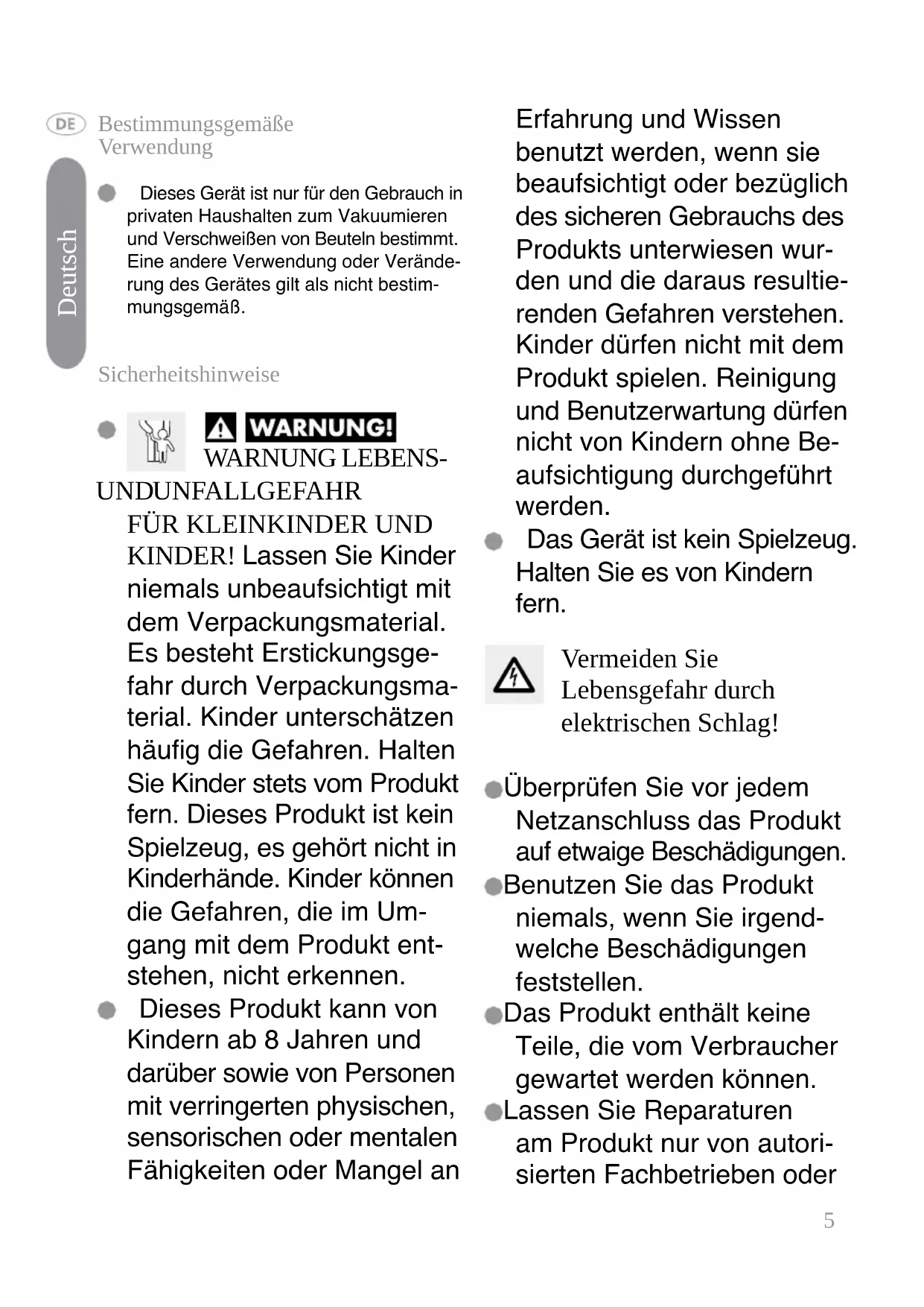 von Speiseresten und Flüssigkeiten zu reinigen. Halten Sie das Innere und Äußere des Geräts trocken, damit das Gerät für den nächsten Gebrauch wieder bereit ist. Deutsch9 Fehlerbehebung Das Gerät funktioniert nicht Prüfen Sie, ob das Gerät ans Stromnetz angeschlossen ist. Untersuchen Sie das Kabel, den Netz- stecker und das Gerät auf Beschädig- ungen. Verwenden Sie das Produkt nicht, wenn eine Beschädigung vorliegt. Es wird kein vollständiges Vakuum im Beutel erzeugt oder das automatische Einschweißen erfolgt nicht Stellen Sie sicher, dass das offene Ende des Vakuumbeutels vollständig innerhalb der Vakuumkammer