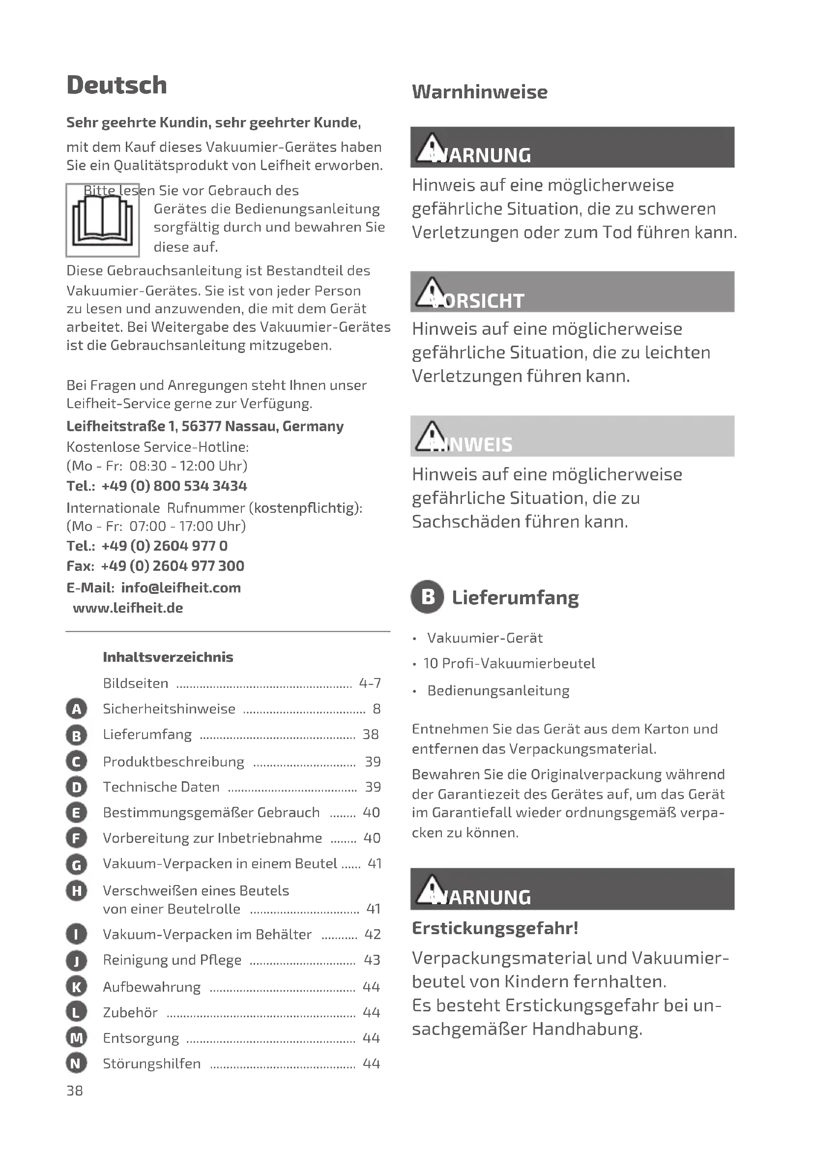 - Störungshilfen Deutsch Sehr geehrte Kundin, sehr geehrter Kunde, mit dem Kauf dieses Vakuumier-Gerätes haben Sie ein Qualitätsprodukt von Leifheit erworben. Bitte lesen Sie vor Gebrauch des Gerätes die Bedienungsanleitung sorgfältig durch und bewahren Sie diese auf. Diese Gebrauchsanleitung ist Bestandteil des Vakuumier-Gerätes. Sie ist von jeder Person zu lesen und anzuwenden, die mit dem Gerät arbeitet. Bei Weitergabe des Vakuumier-Gerätes ist die Gebrauchsanleitung mitzugeben. p. 44