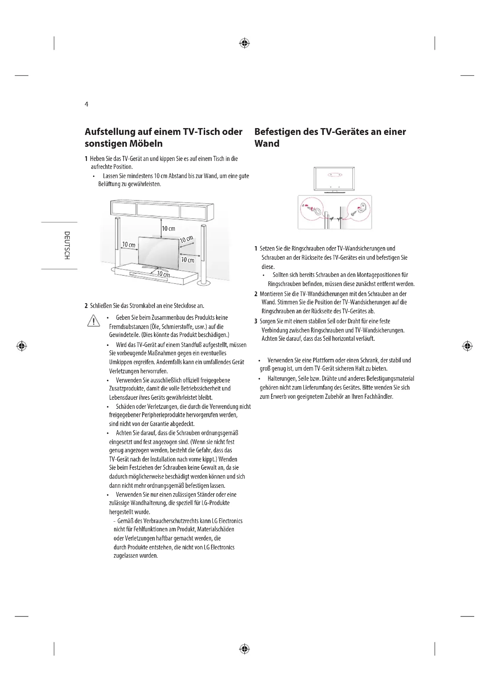 - Wird das TV-Gerät auf einem Standfuß aufgestellt, müssen Sie vorbeugende Maßnahmen gegen ein eventuelles Umkippen ergreifen. Andernfalls kann ein umfallendes Gerät Verletzungen hervorrufen.