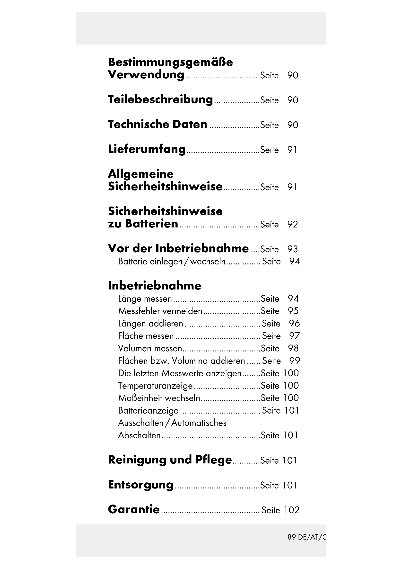 Bestimmungsgemäße Verwendung ................................Seite 90 Teilebeschreibung ....................Seite 90 Technische Daten ......................Seite 90 Lieferumfang ................................Seite 91 Allgemeine Sicherheitshinweise ................Seite 91 Sicherheitshinweise zu Batterien ...................................Seite 92 Vor der Inbetriebnahme ....Seite 93 Batterie einlegen / wechseln ...............Seite 94 Inbetriebnahme Länge messen ......................................Seite 94 Messfehler vermeiden .........................Seite 95 Längen addieren ................................. Seite 96 Fläche messen ..................................... Seite 97 Volumen messen..................................Seite 98 Flächen bzw. Volumina addieren ...... Seite 99 Die letzten Messwerte anzeigen ........Seite 100 Temperaturanzeige .............................Seite 100 Maßeinheit wechseln ..........................Seite 100 Batterieanzeige ................................... Seite 101 Ausschalten / Automatisches Abschalten ...........................................Seite 101 Reinigung und Pflege ............Seite 101 Entsorgung .....................................Seite 101 Garantie ...........................................Seite 10290 DE/AT/CH Ultraschall-Entfernungsmesser Bestimmungsgemäße Verwendung Dieser Ultraschall-Entfernungsmesser ist zur Messung von Längen sowie zur Berechnung von Flächen und Volumina vorgesehen. Zusätzlich verfügt das Gerät über eine Temperaturmessung. Das Gerät ist ausschließlich zur privaten Verwen- dung vorgesehen. Teilebeschreibung