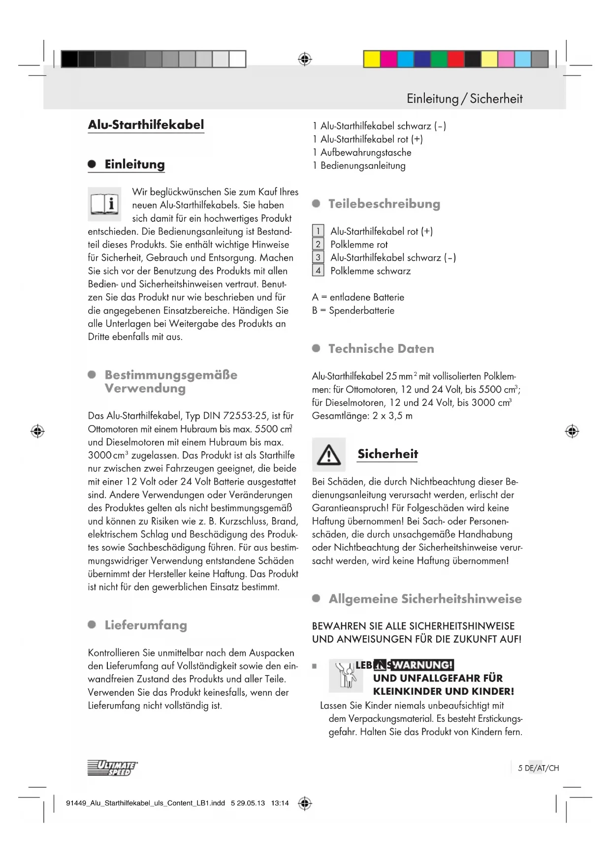91449_Alu_Starthilfekabel_uls_Cover_LB1.indd 4 29.05.13 13:1491449_Alu_Starthilfekabel_uls_Cover_LB1.indd 5 29.05.13 13:145 DE/AT/CH Einleitung / Sicherheit Alu-Starthilfekabel Einleitung Wir beglückwünschen Sie zum Kauf Ihres neuen Alu-Starthilfekabels. Sie haben sich damit für ein hochwertiges Produkt entschieden. Die Bedienungsanleitung ist Bestand- teil dieses Produkts. Sie enthält wichtige Hinweise für Sicherheit, Gebrauch und Entsorgung. Machen Sie sich vor der Benutzung des Produkts mit allen Bedien- und Sicherheitshinweisen vertraut. Benut- zen Sie das Produkt nur wie beschrieben und für die angegebenen Einsatzbereiche. Händigen Sie alle Unterlagen bei Weitergabe des Produkts an Dritte ebenfalls mit aus. Bestimmungsgemäße Verwendung Das Alu-Starthilfekabel, Typ DIN 72553-25, ist für Ottomotoren mit einem Hubraum bis max. 5500 cm