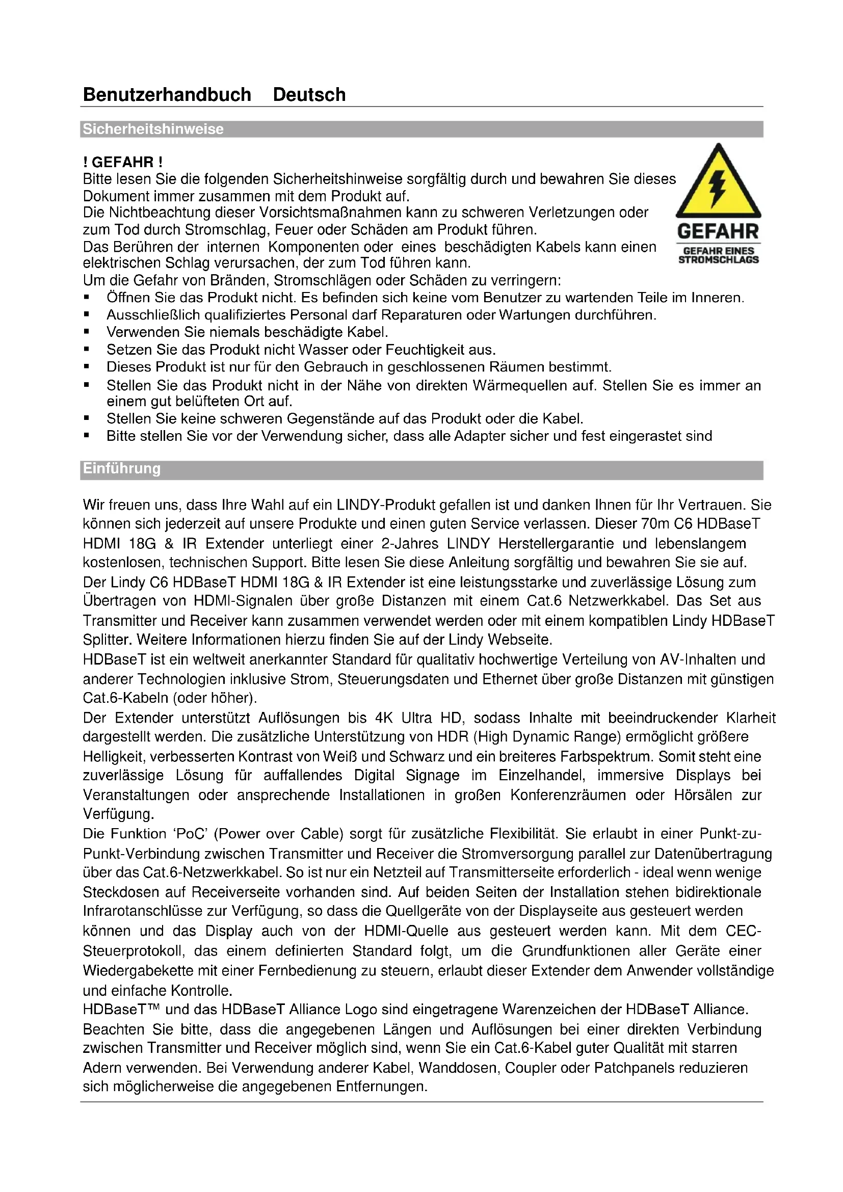 - Reduce the length of Cat.6/7 or HDMI cable used or use a higher quality cable. Lindy regularly checks and tests our product range to ensure maximum compatibility and performance. For the most up to date version of this manual, please refer to your local Lindy website, search for the relevant part number and find the manual under Downloads.Benutzerhandbuch Deutsch Sicherheitshinweise ! GEFAHR ! Bitte lesen Sie die folgenden Sicherheitshinweise sorgfältig durch und bewahren Sie dieses Dokument immer zusammen mit dem Produkt auf. Die Nichtbeachtung dieser Vorsichtsmaßnahmen kann zu schweren Verletzungen oder zum Tod durch Stromschlag, Feuer oder Schäden am Produkt führen. Das Berühren der internen Komponenten oder eines beschädigten Kabels kann einen elektrischen Schlag verursachen, der zum Tod führen kann. Um die Gefahr von Bränden, Stromschlägen oder Schäden zu verringern: